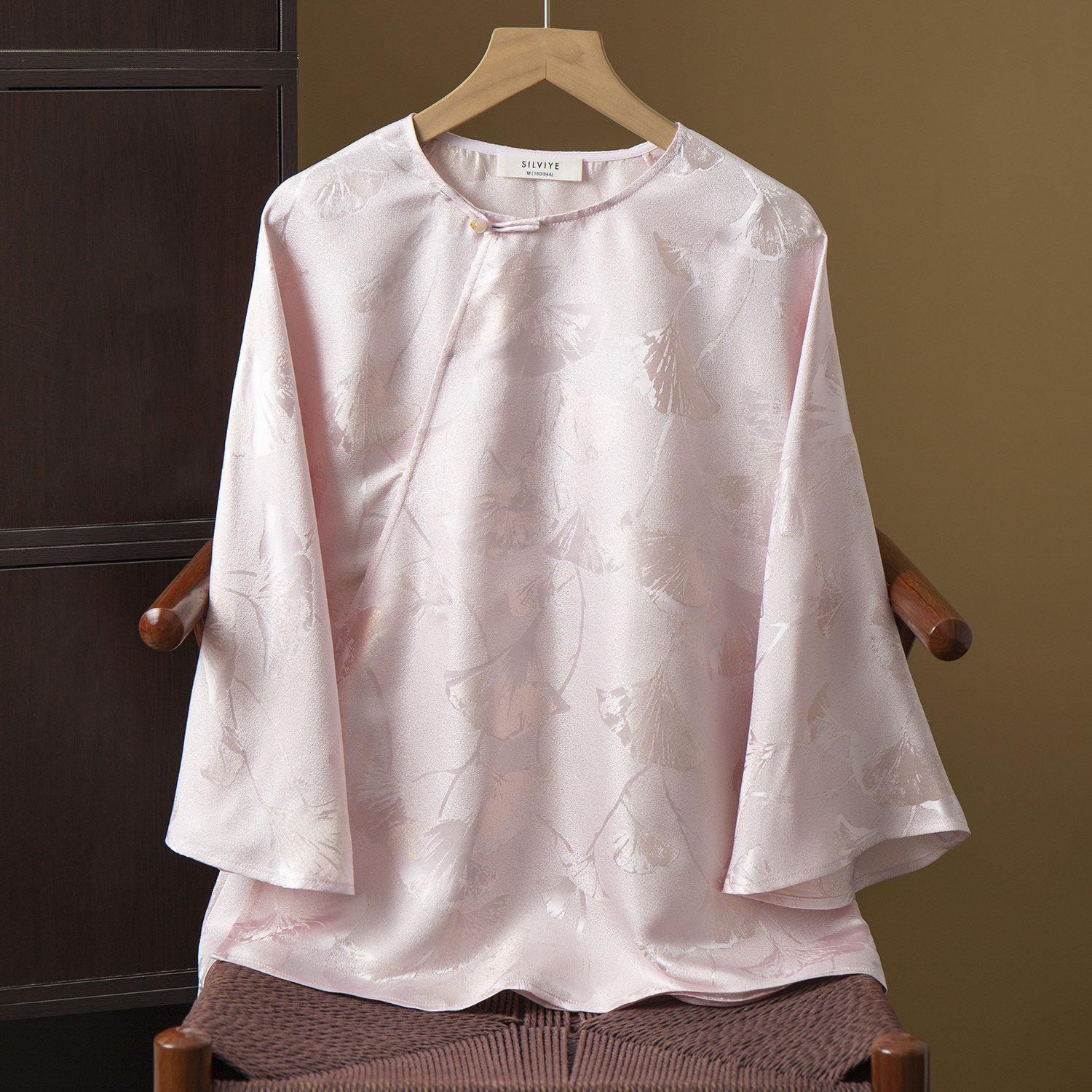 亏清 100%桑蚕丝织金银杏叶提花螺钿正绢真丝上衣女圆领斜襟小衫由
