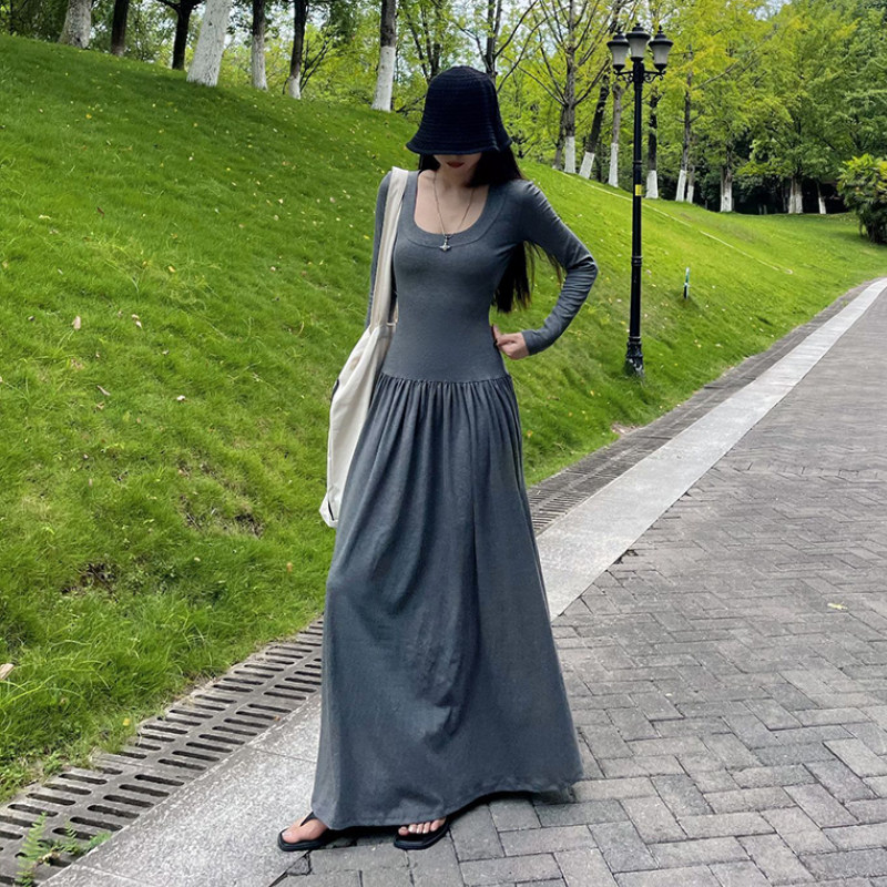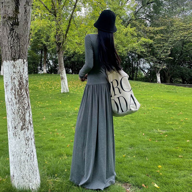 针织灰色连衣裙 秋季 新款 芭蕾风 收腰显瘦U领气质拖地长裙女 修身