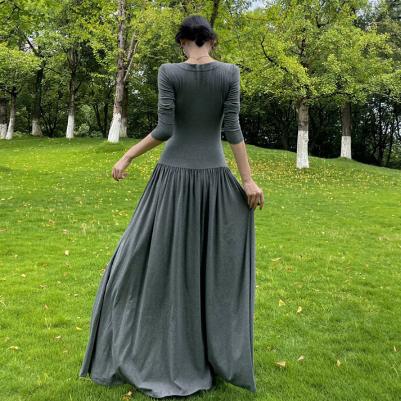 针织灰色连衣裙 秋季 新款 芭蕾风 收腰显瘦U领气质拖地长裙女 修身由