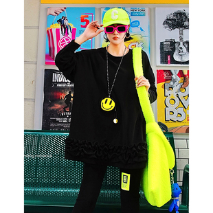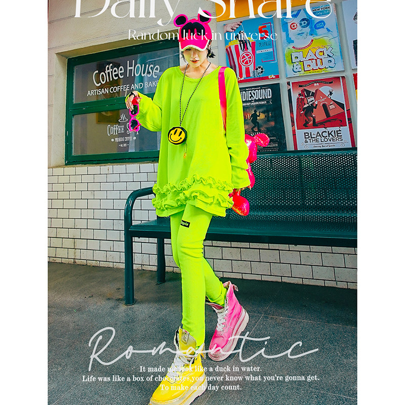 YHAY荧光绿彩色加绒休闲卫衣秋冬款 荷叶边潮牌大码 宽松打底衫 韩版