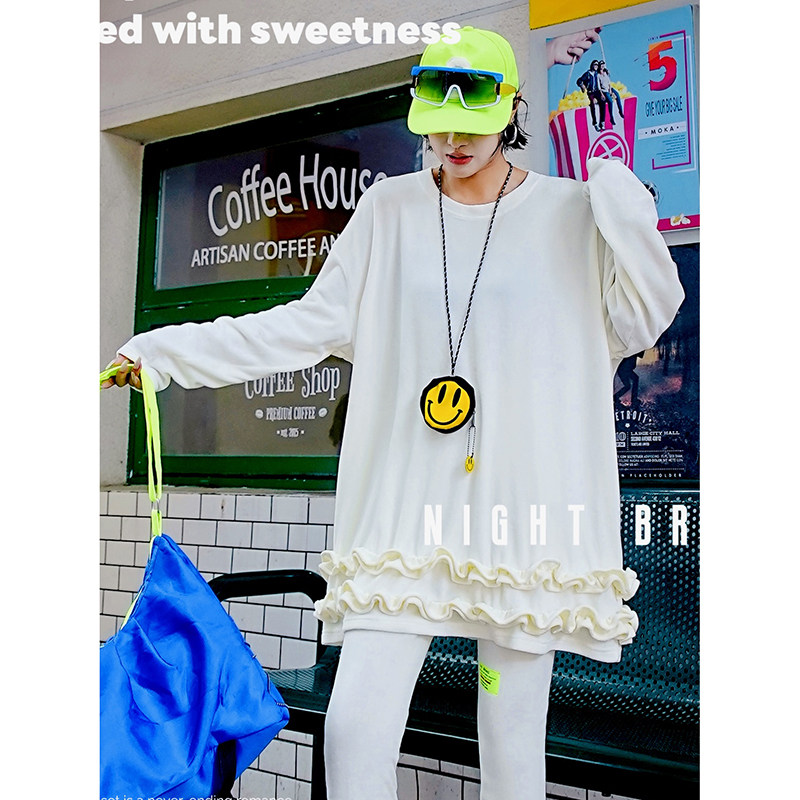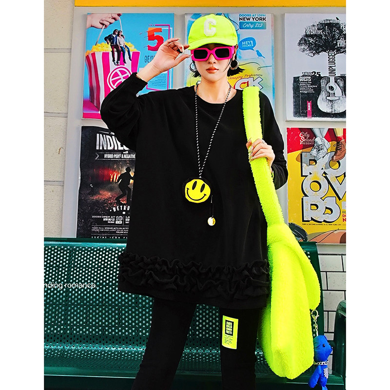 YHAY荧光绿彩色加绒休闲卫衣秋冬款 荷叶边潮牌大码 宽松打底衫 韩版由