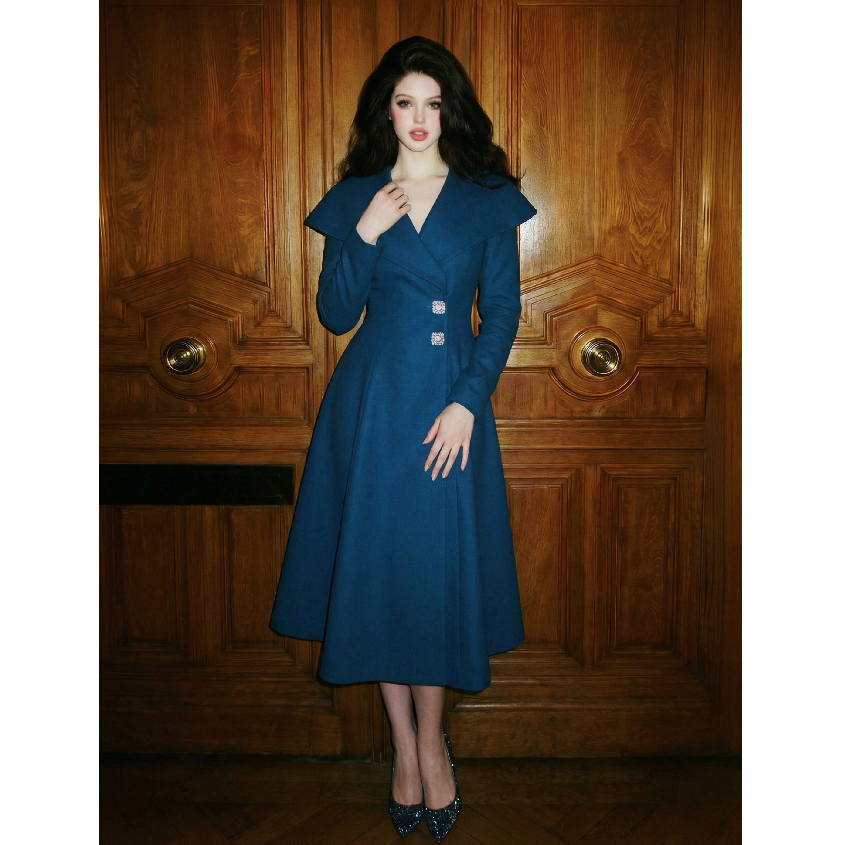 Labor Love 孔雀翎 原创设计复古湖蓝钻扣翻领A字收腰羊毛大衣由