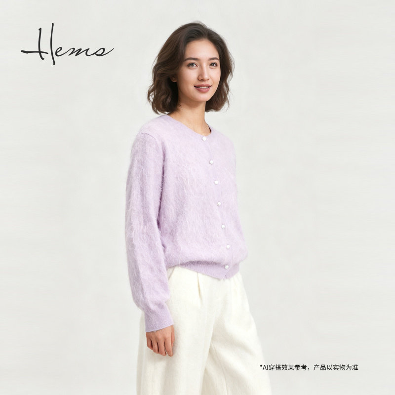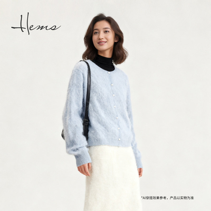 海尔曼斯25秋冬新品 圆领拉绒雾感短款 简约羊绒衫 D4985D71 云端经典