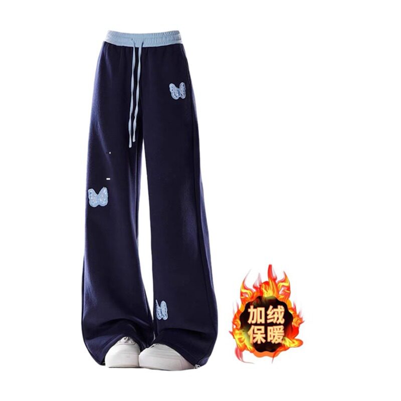 胖mm直筒加绒裤 美式 子 大码 运动卫裤 蝴蝶贴布阔腿休闲裤 女秋冬新款