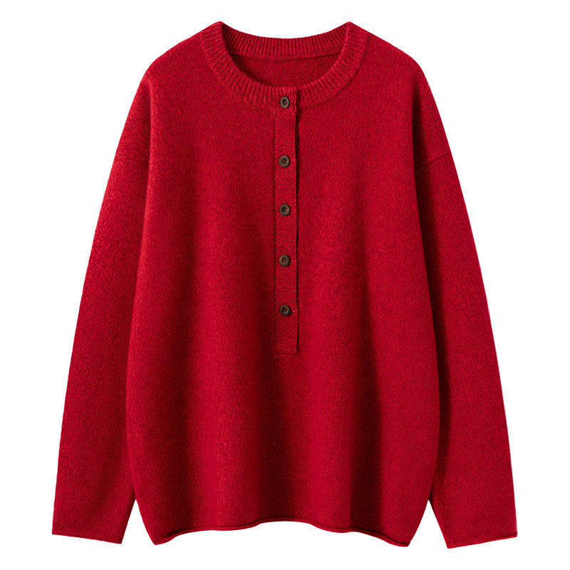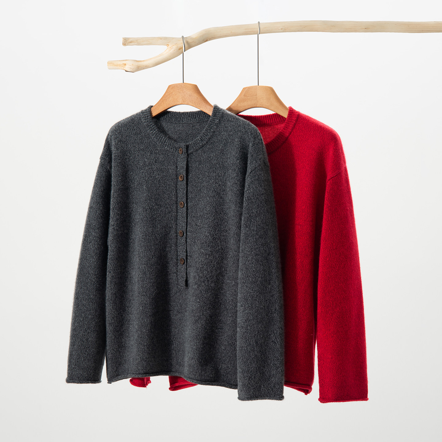 女圆领单排扣半开宽松百搭显瘦针织打底衫 100%纯山羊绒衫 秋冬新款
