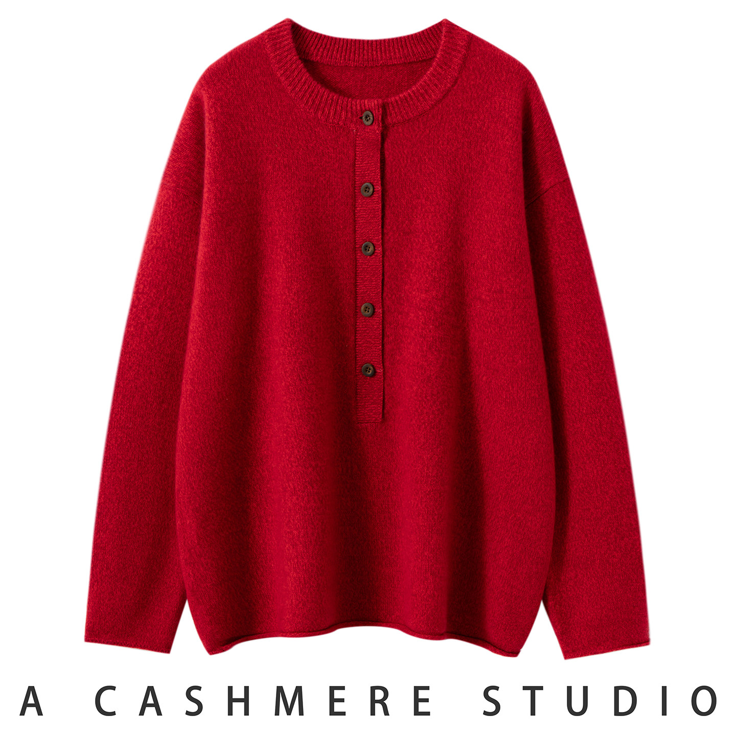 女圆领单排扣半开宽松百搭显瘦针织打底衫 100%纯山羊绒衫 秋冬新款由