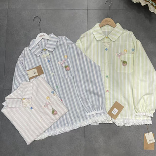 日系复古条纹蝴蝶结花边拼接衬衣春季 可爱校园风百搭长袖 衬衫 新款