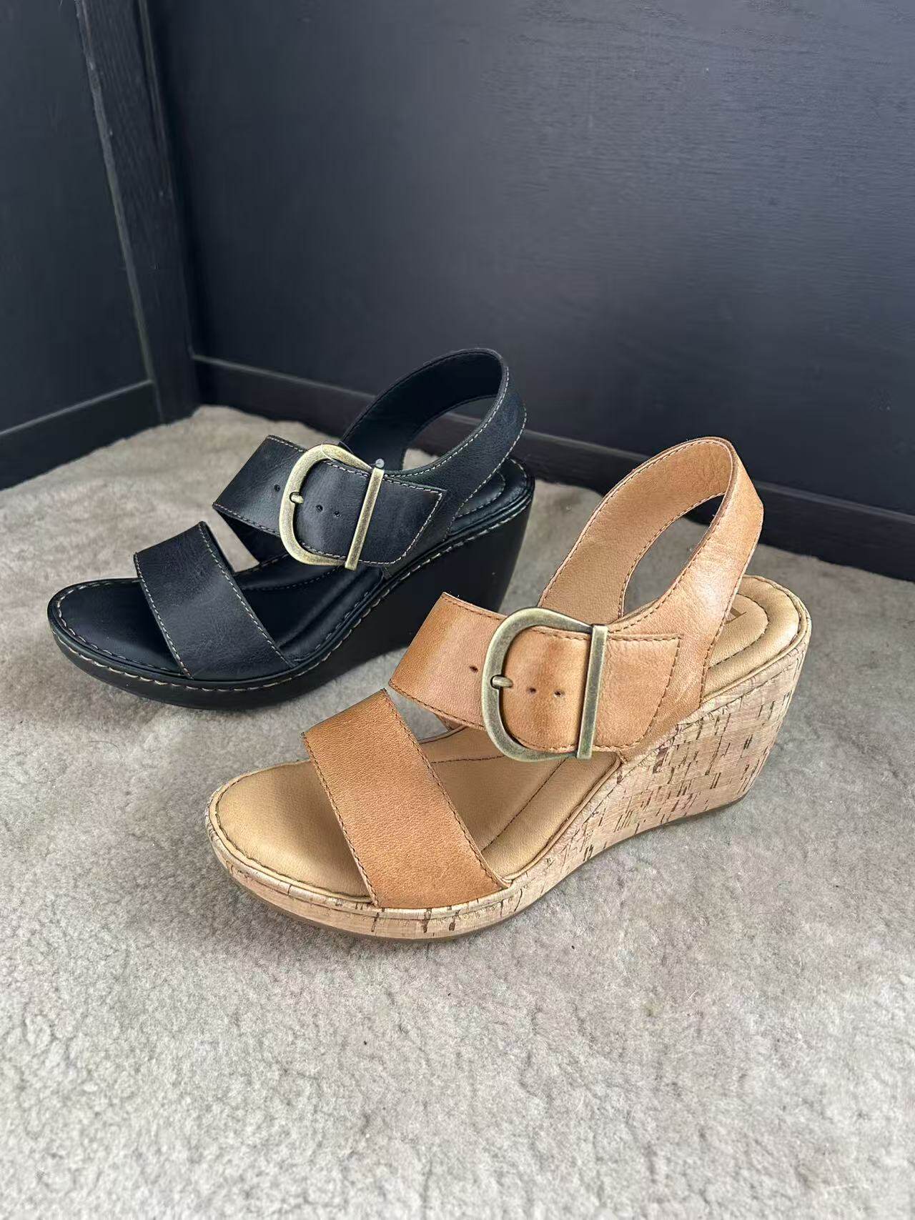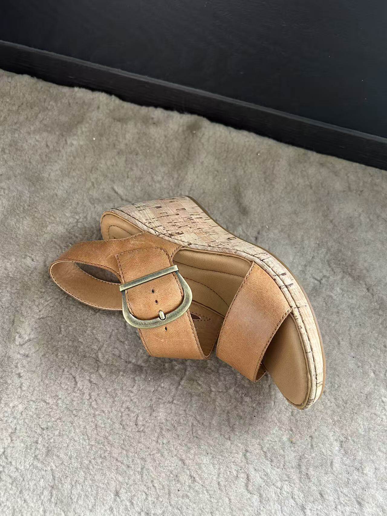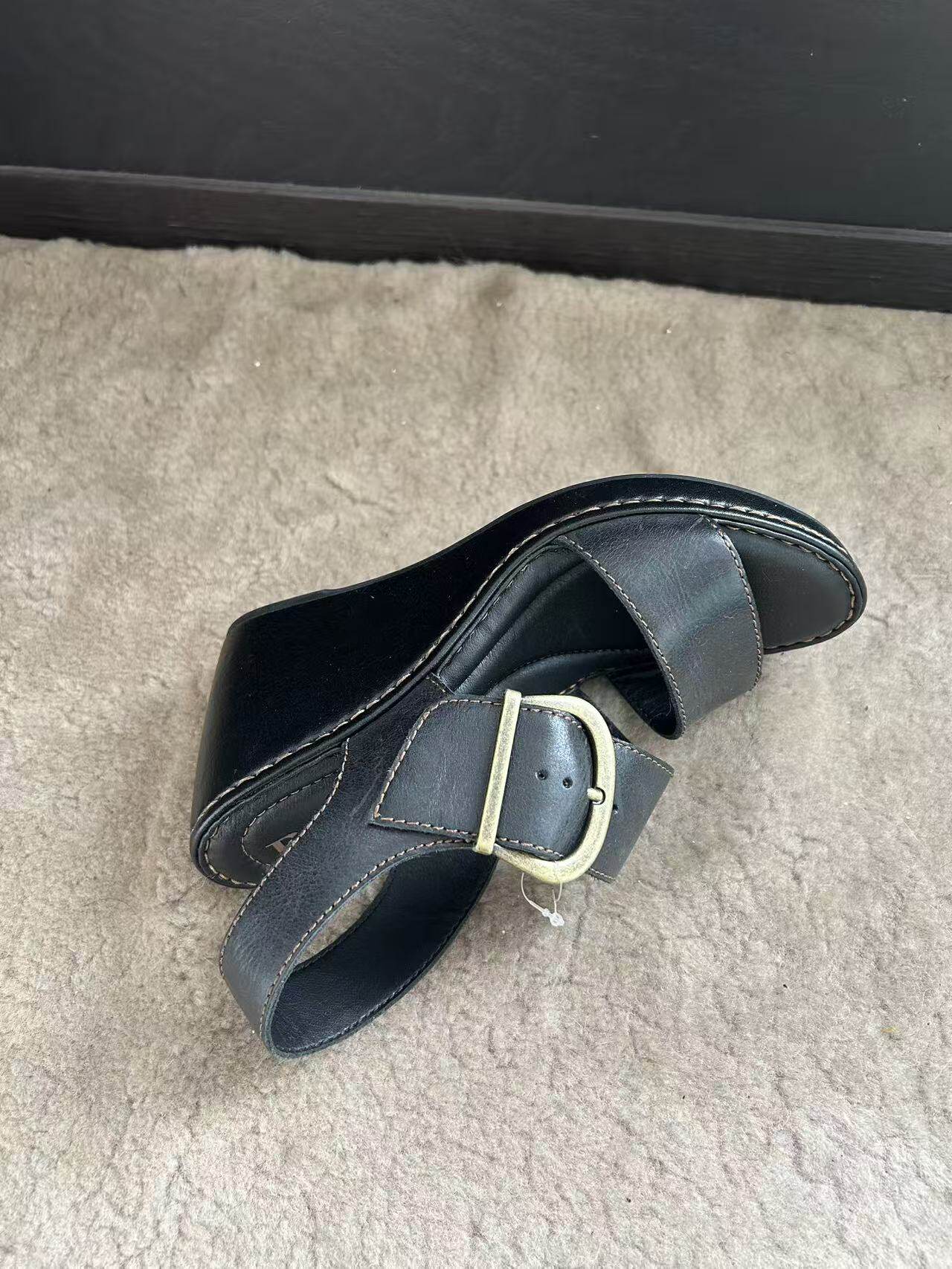 头层牛皮大扣袢女士厚底增高坡跟凉鞋 born