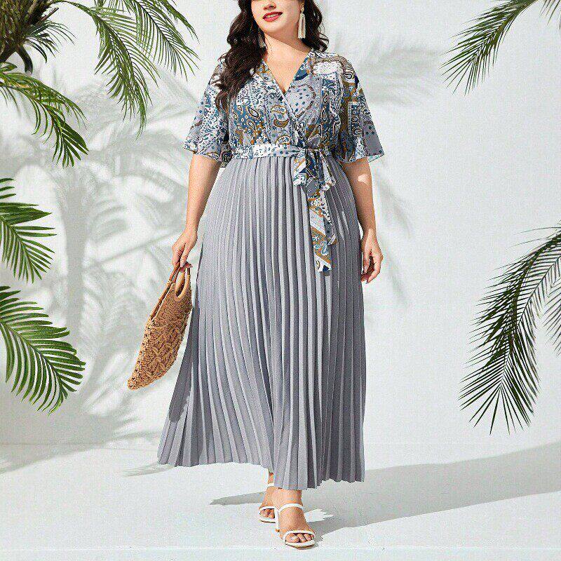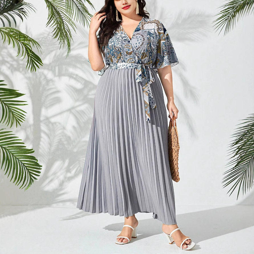 dress women size 印花V领拼接连衣裙 skirt大码 女装 ladies Plus