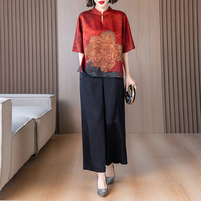 女夏装 上衣中老年香云纱国风老太太两件套 妈妈真丝套装 洋气新中式