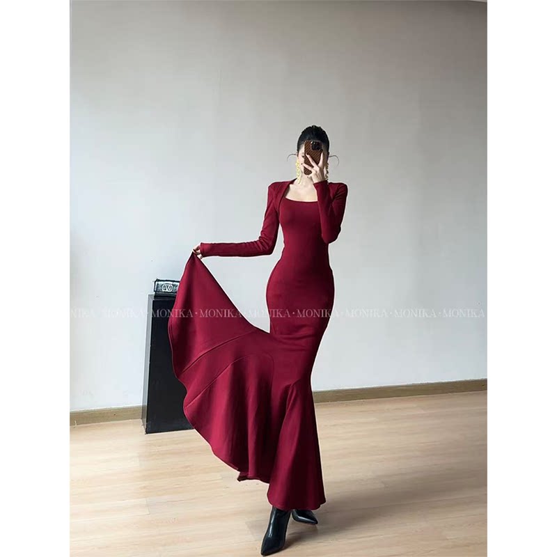 秋冬方领步步生莲鱼尾新款 气质性感长裙25168 黑底步步生莲
