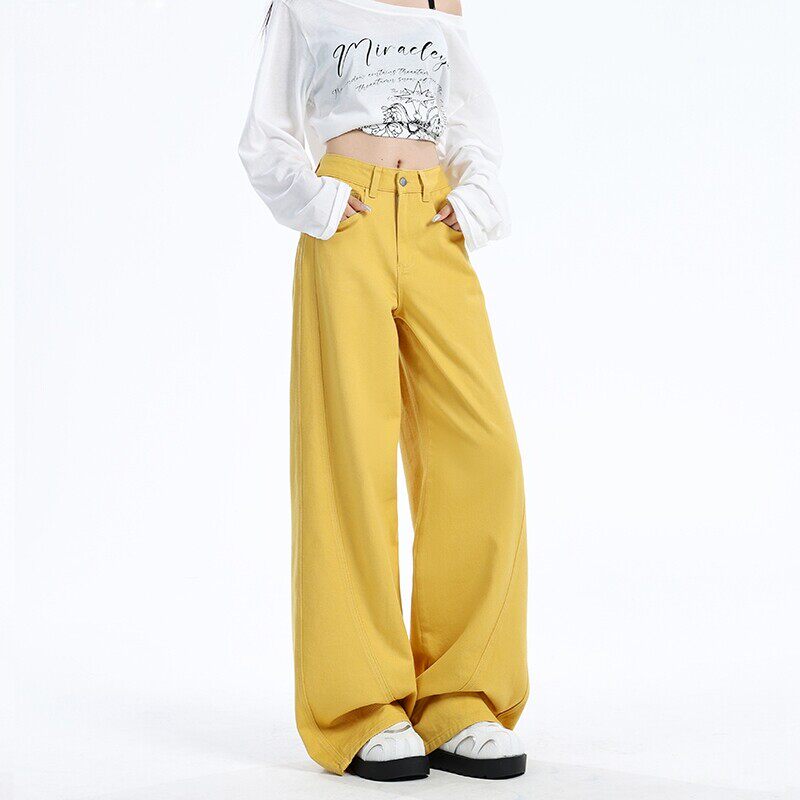 女春秋季 EGG SLY美式 黄色阔腿牛仔裤 子 宽松直筒设计垂感拖地裤