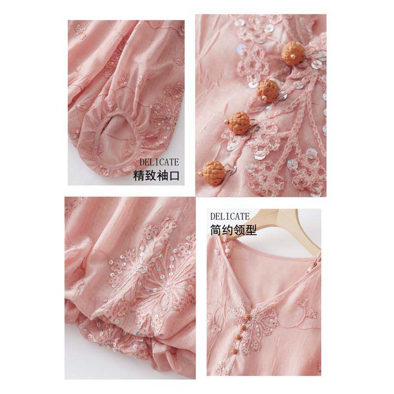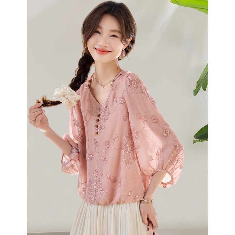为您提供商品雪纺超好看灯笼袖 亮片T恤气质宽松温柔V领刺绣上衣女 新款 2025夏季的详细介绍,