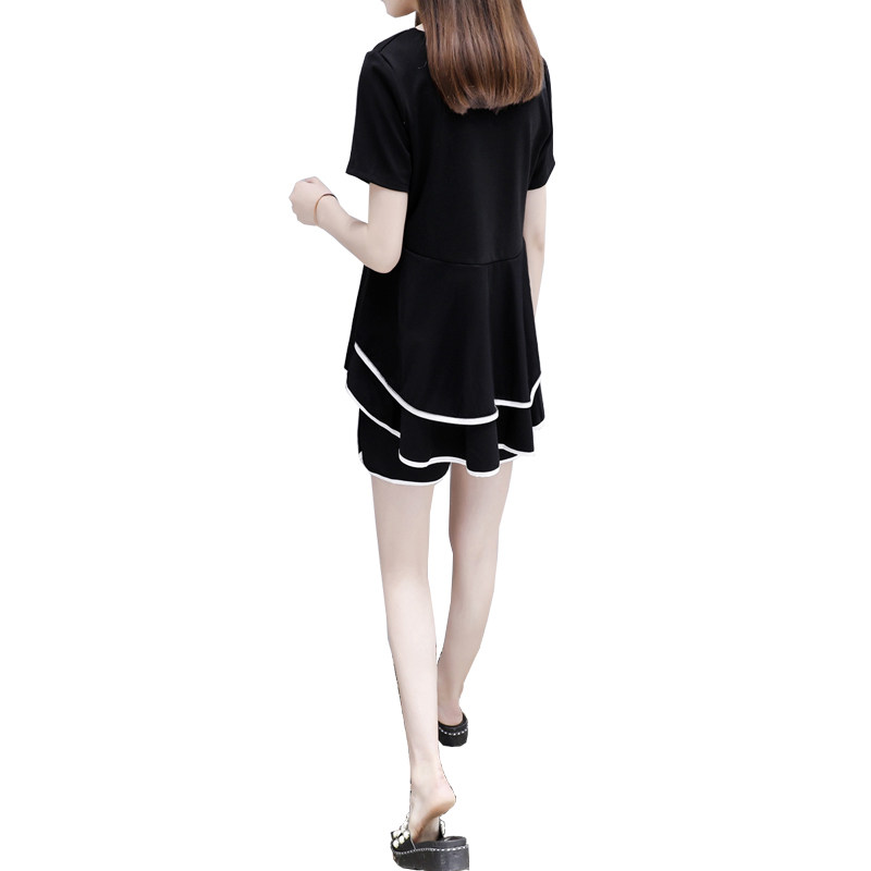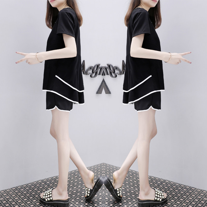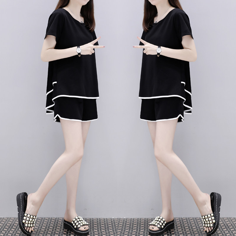 女装 2021夏季 休闲两件套装 前短后长黑色宽松上衣显瘦短裤 新款 时尚