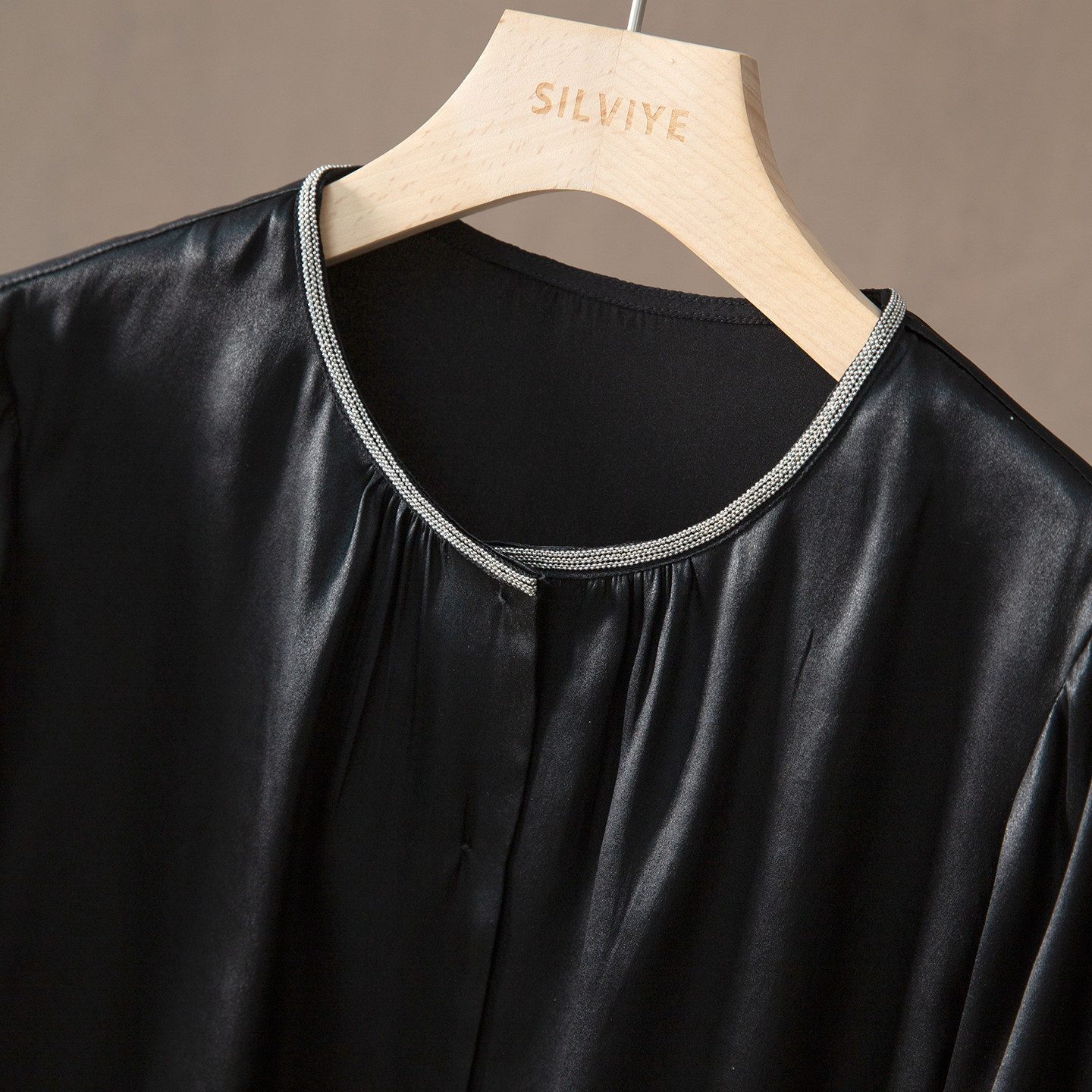 为您提供商品高定 上衣女设计感镶砖桑蚕丝缎面外套春 真丝香云纱黑色圆领衬衫的详细介绍,