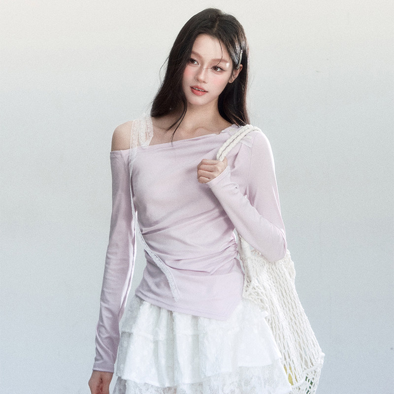 T恤温柔风内搭春 fragileheart易碎商店·柔风叙事褶皱感斜肩长袖由