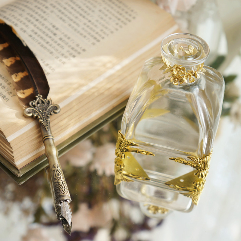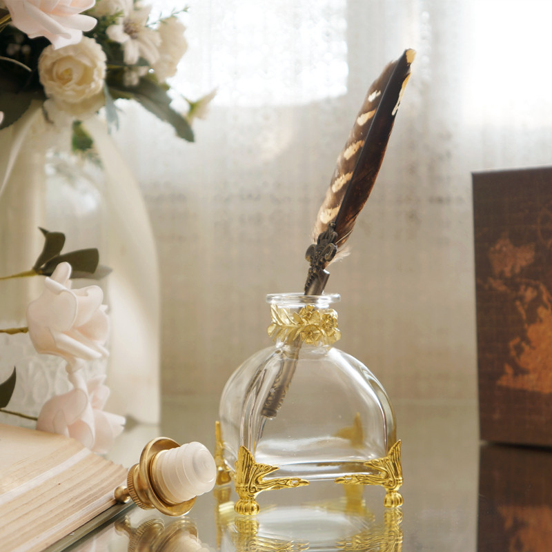 墨水瓶复古铜鎏金玻璃瓶羽毛蘸水笔插西洋宫廷美物书法摆件欧式