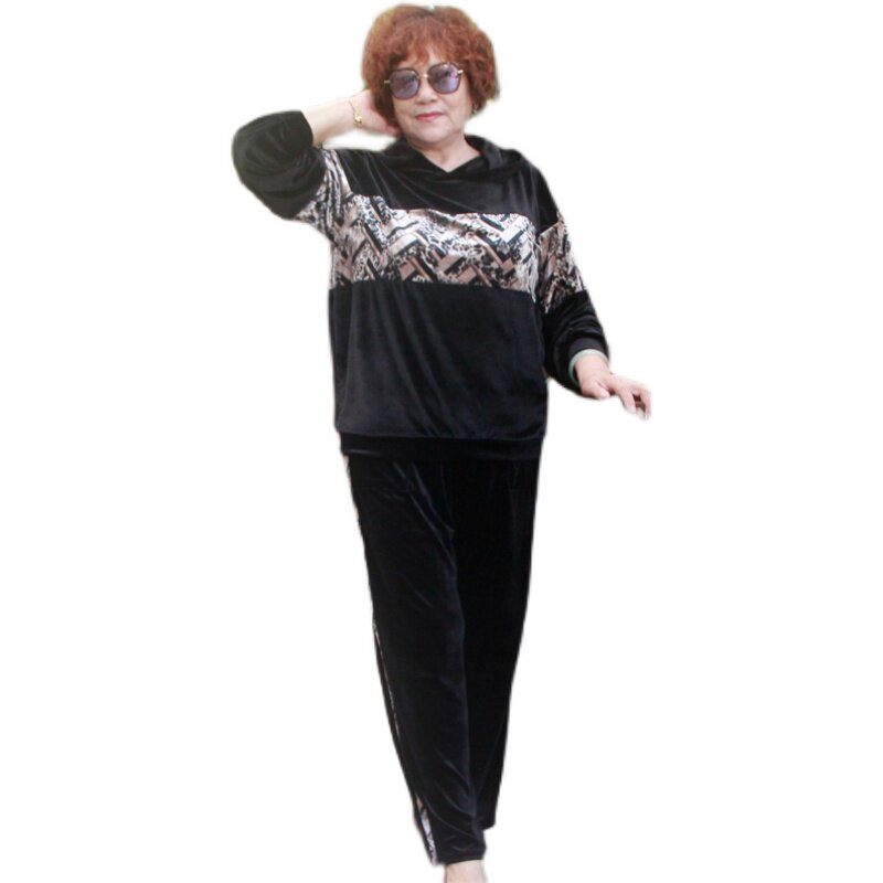 中老年女士春秋金丝绒连帽两件套加肥大码 胖妈妈宽松洋气运动套装
