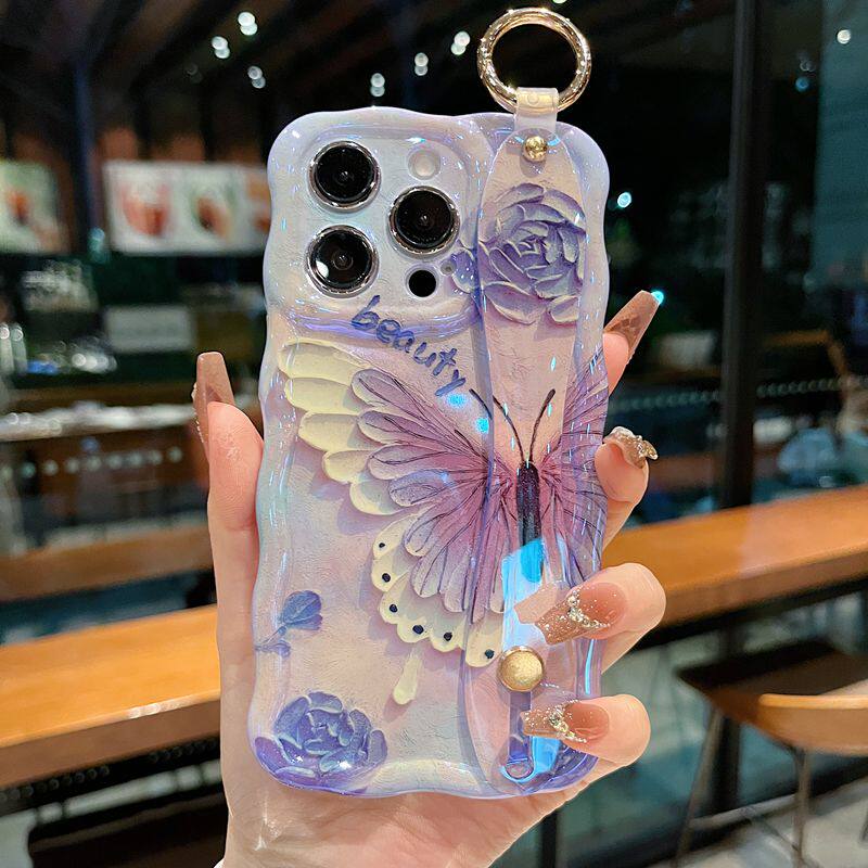 适用苹果系列iPhone16新款 玫瑰蓝蝴蝶13pro16promax全包镜头膜扭扭边腕带防摔保护套 手机壳15pro14promax个性