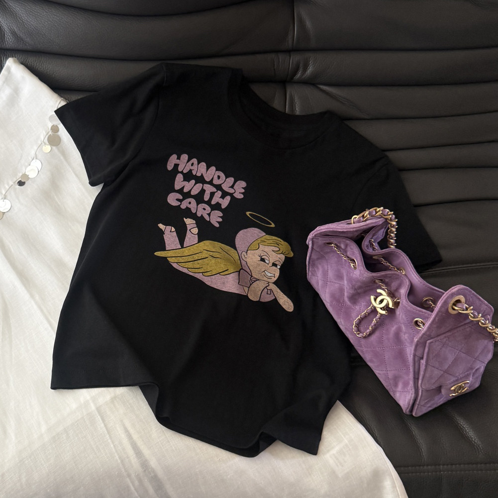 丘比特天使印花短袖 美式 复古百搭小版 型棉麻上衣 T恤