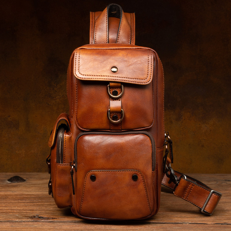 为您提供商品男士 拉链斜挎包潮流牛皮单肩包大容量胸包 植鞣皮擦色男包竖款 新款的详细介绍,