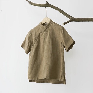 夏季 国风亚麻改良版 短款 旗袍上衣女中短袖 百搭民族茶艺服T恤衫