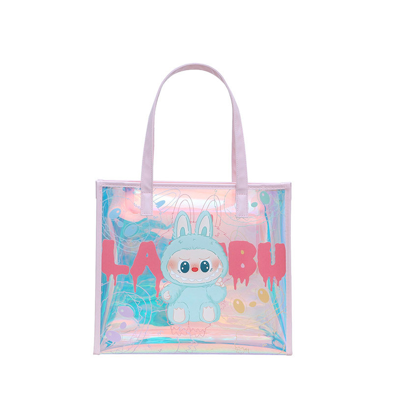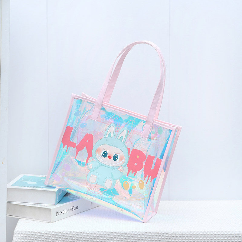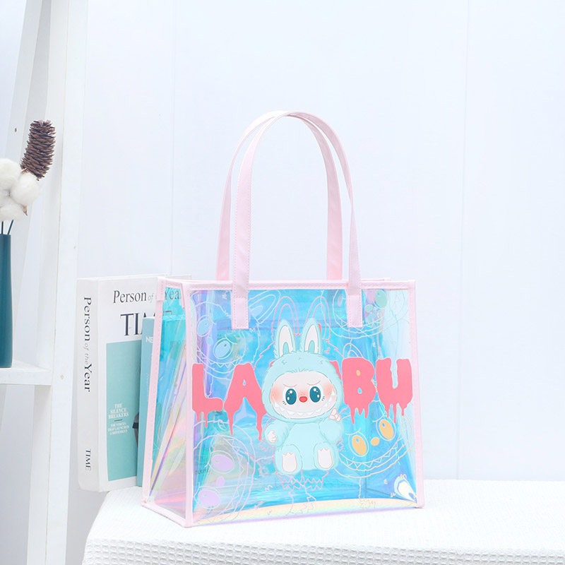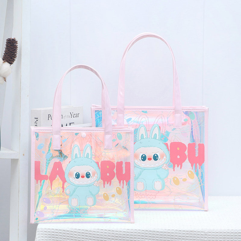 尚盈粉蓝labubu炫彩PVC透明手提袋大容量补习防水书袋手提果冻包
