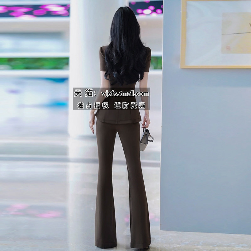 VJE干练气质OL套装 新款 洋气花边显瘦上衣喇叭裤 两件套 女夏季