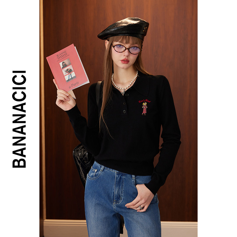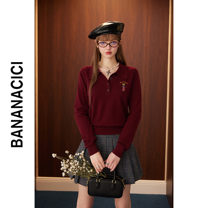 BANANA CICI2024年冬原创BC艺术家刺绣安可拉红POLO领针织衫由