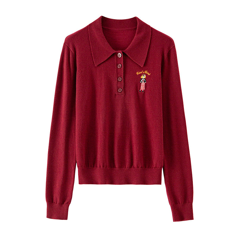 BANANA CICI2024年冬原创BC艺术家刺绣安可拉红POLO领针织衫