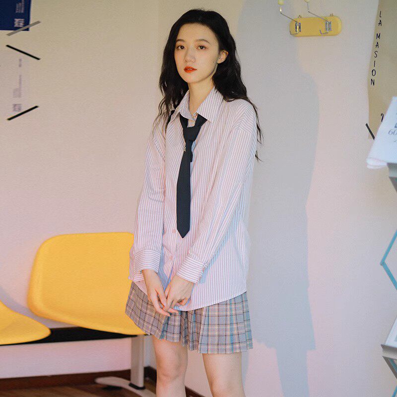 女宽松百搭纯色长袖 上衣 学院风条纹衬衫 光影斑驳 秒杀 款