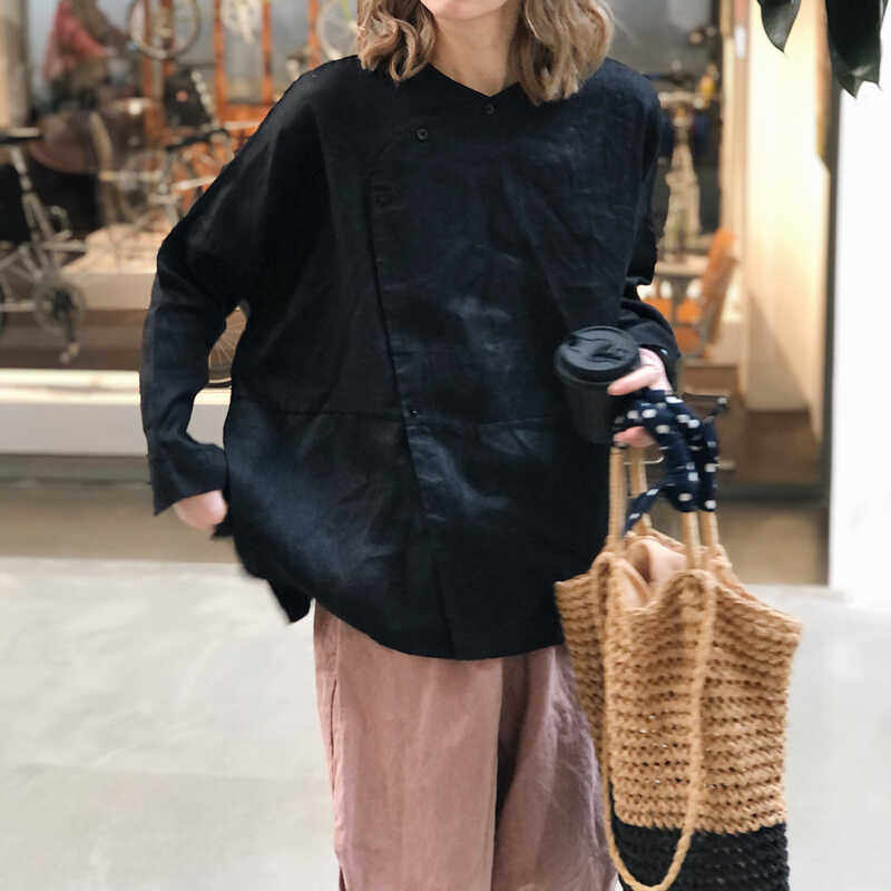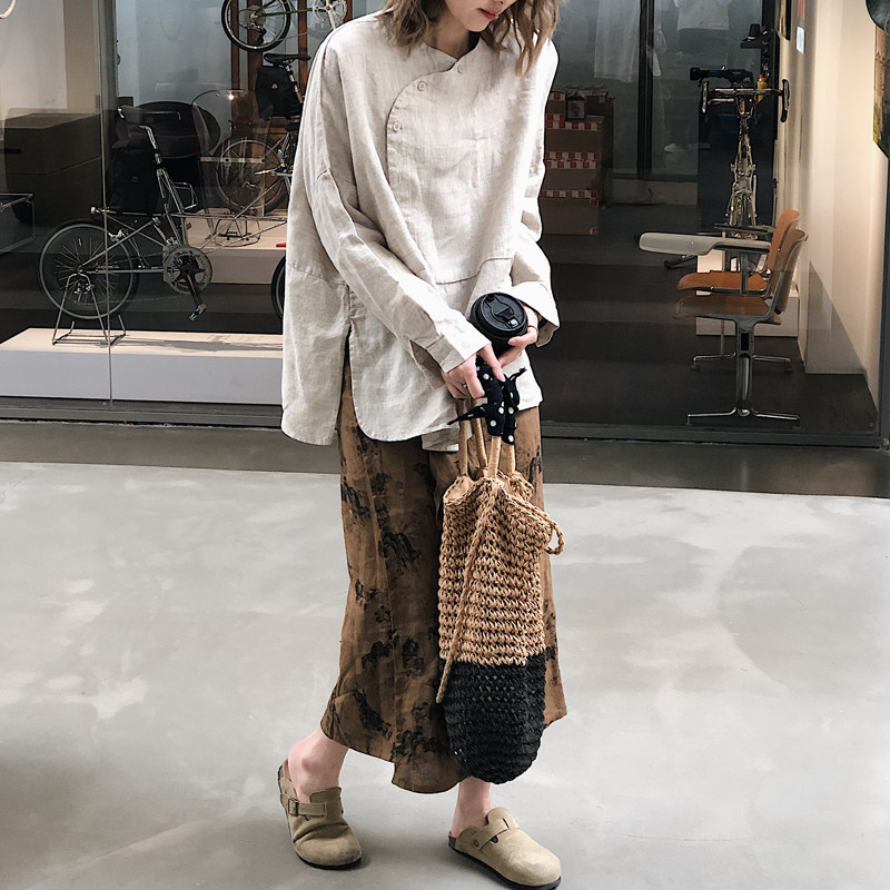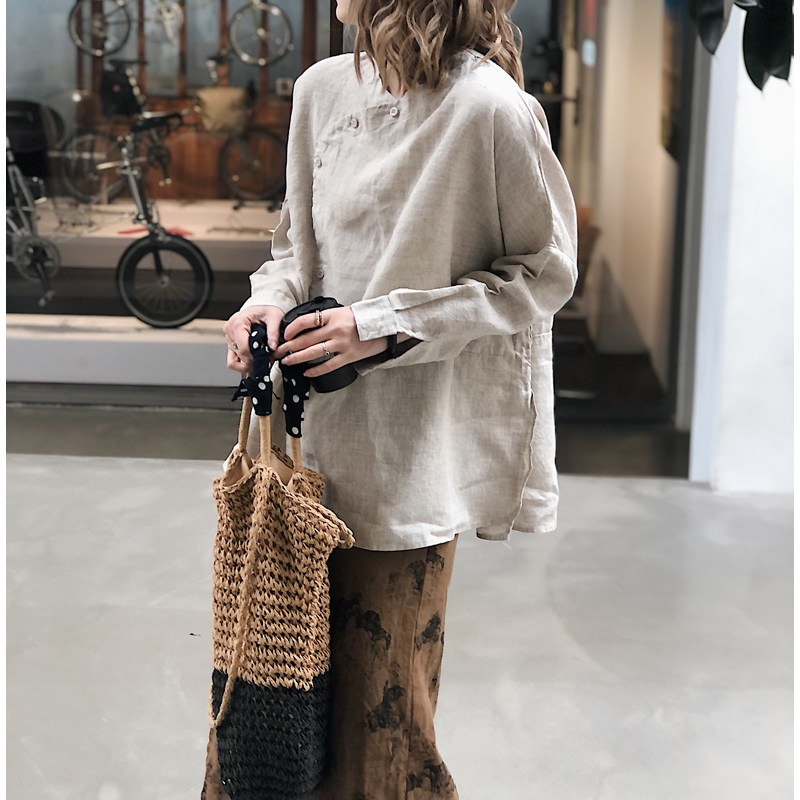 小衫 新中式 女 长袖 侧开衩侧边纽扣纯亚麻上衣文艺衬衫 大码 春秋新款