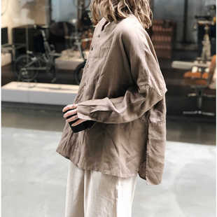 小衫 新中式 女 长袖 侧开衩侧边纽扣纯亚麻上衣文艺衬衫 大码 春秋新款由