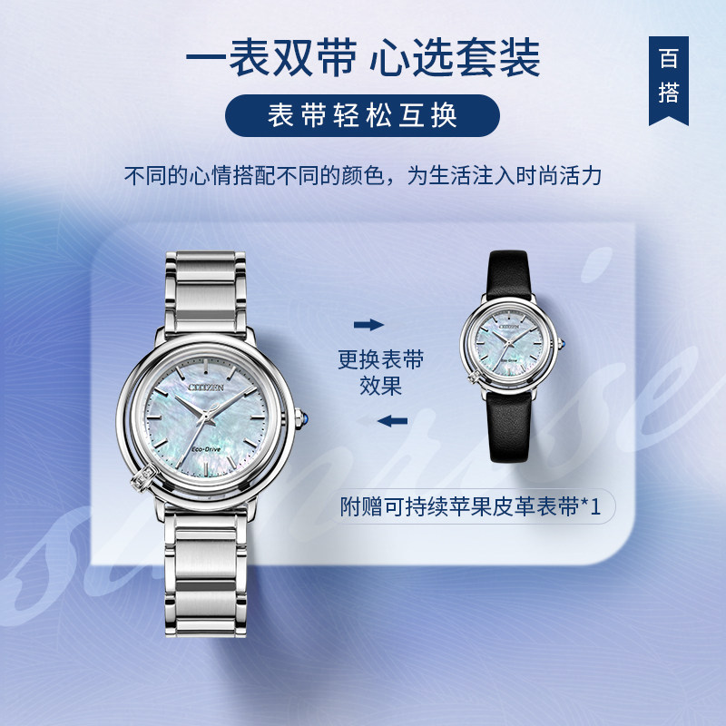 为您提供商品西铁城官方正品 休闲钢带女士手表EM1090 光动能镶钻贝母盘时尚的详细介绍,