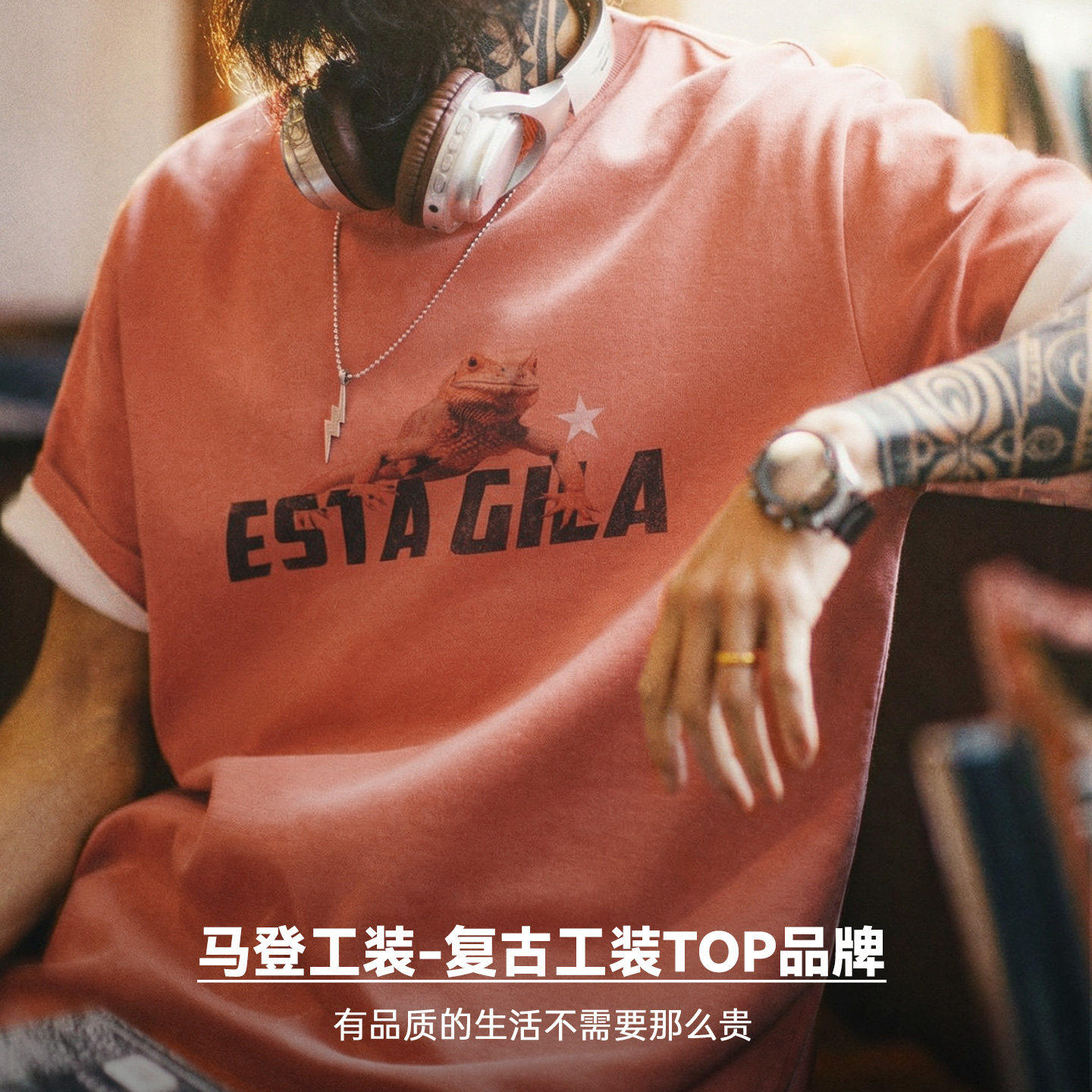 马登工装 复古印花短袖 上衣圆领落肩落日橘红色针织T恤男夏季 美式