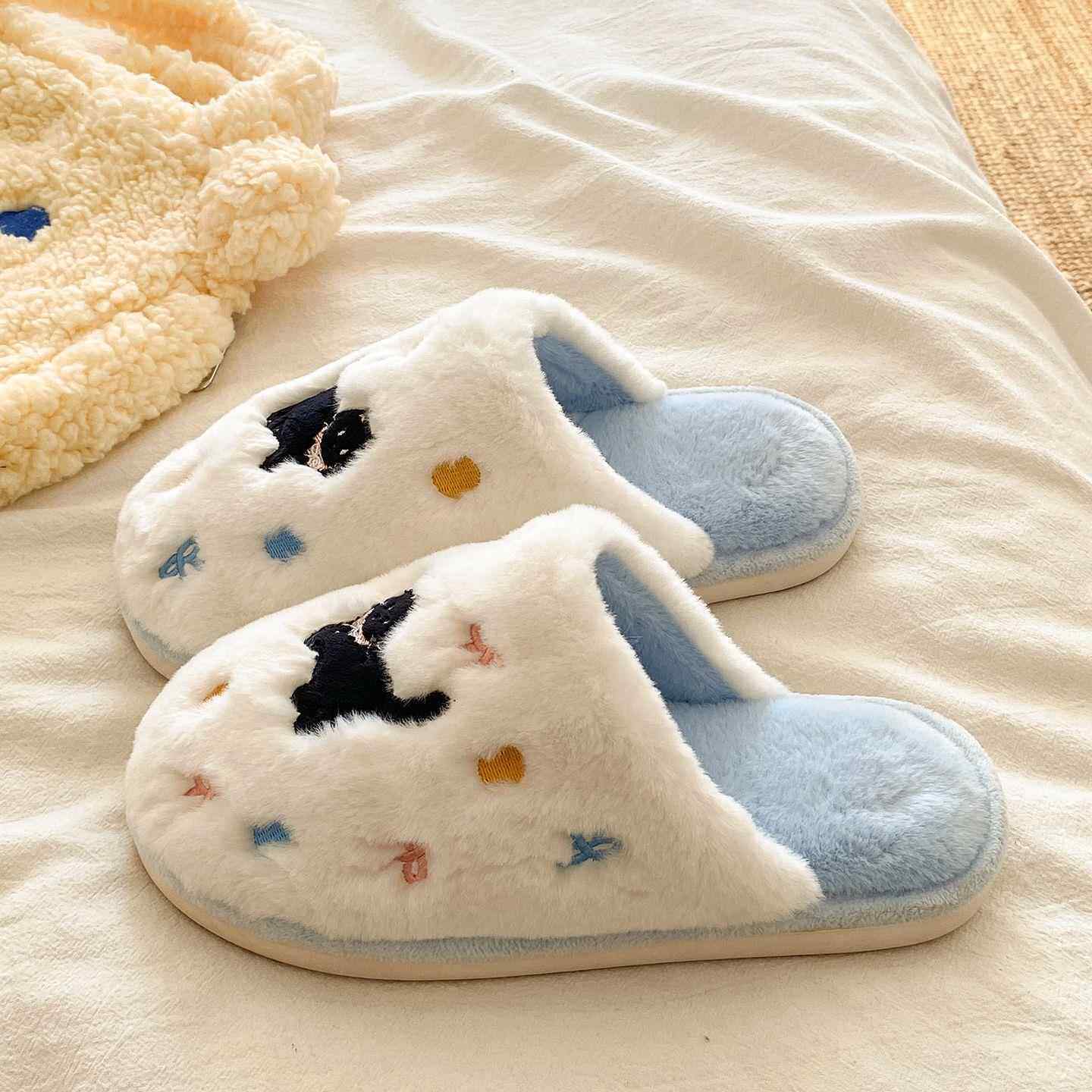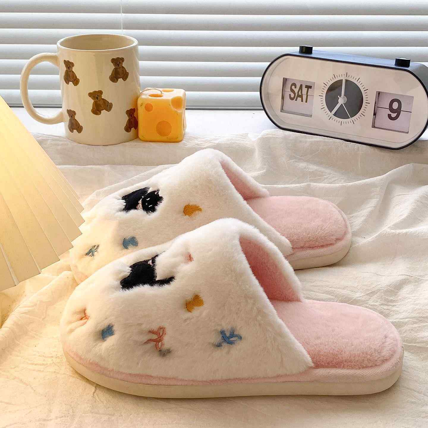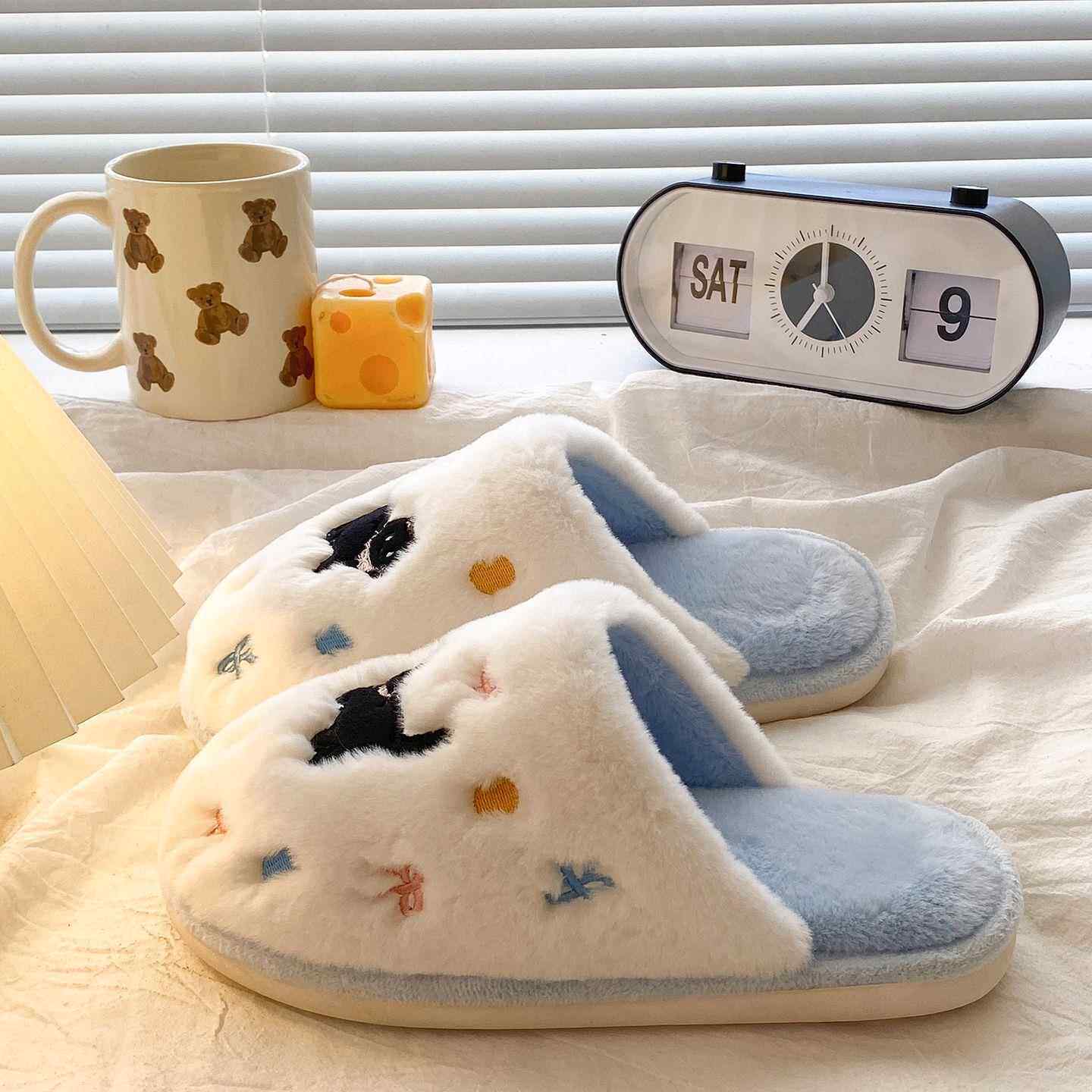2025新款 秋冬季 居家室内保暖拖鞋 女 休闲舒适毛茸茸绣花小猫棉拖鞋