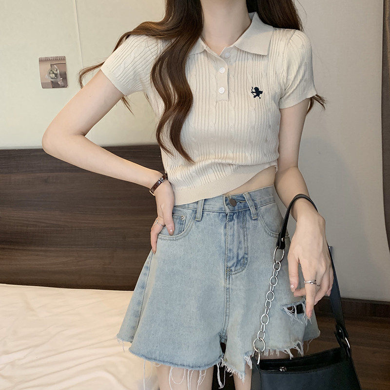 t恤女短款 别致甜辣夏季 显瘦上衣 短袖 polo领针织小衫 法式 小众时尚