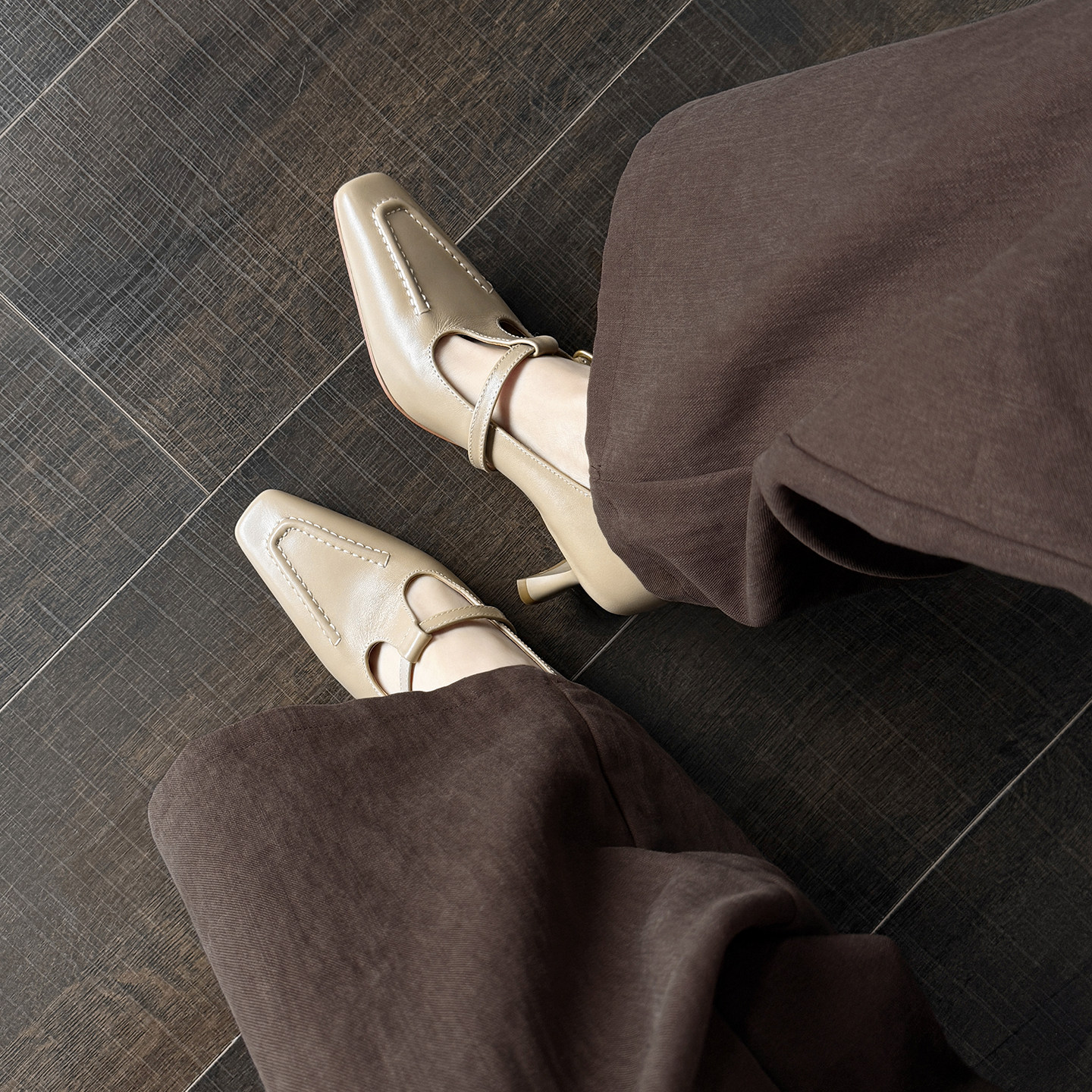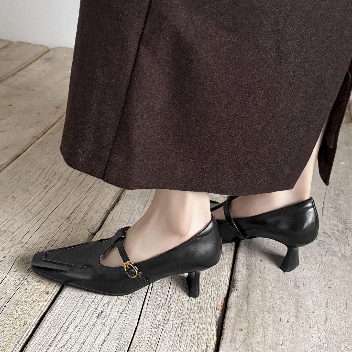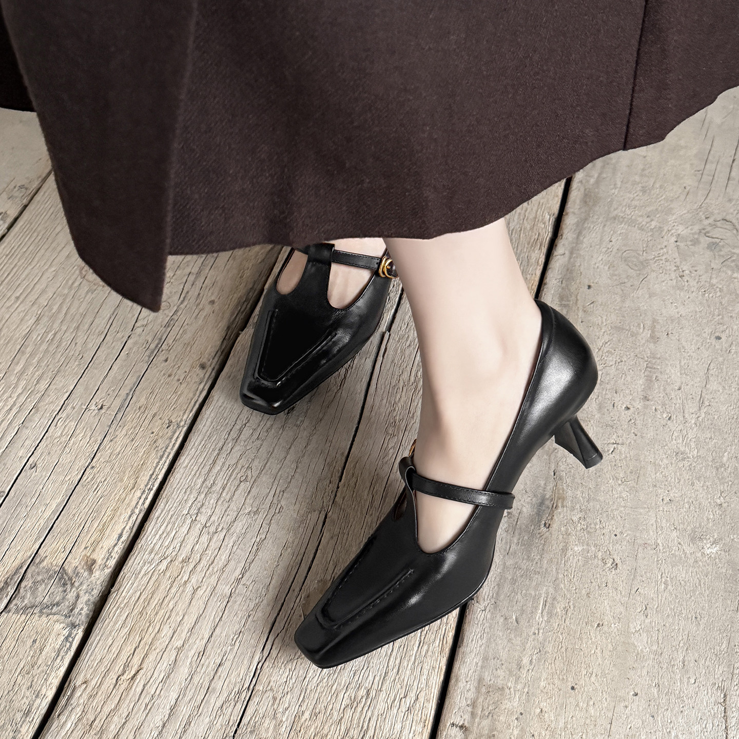 真皮高跟鞋 法式 知性风玛丽珍鞋 女新款 方头T字扣带显瘦通勤OL单鞋