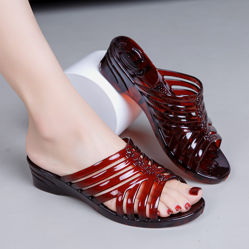 透明水晶妈妈塑料坡跟女拖鞋 坡跟厚底居家室外凉拖鞋 塑胶拖鞋 夏季