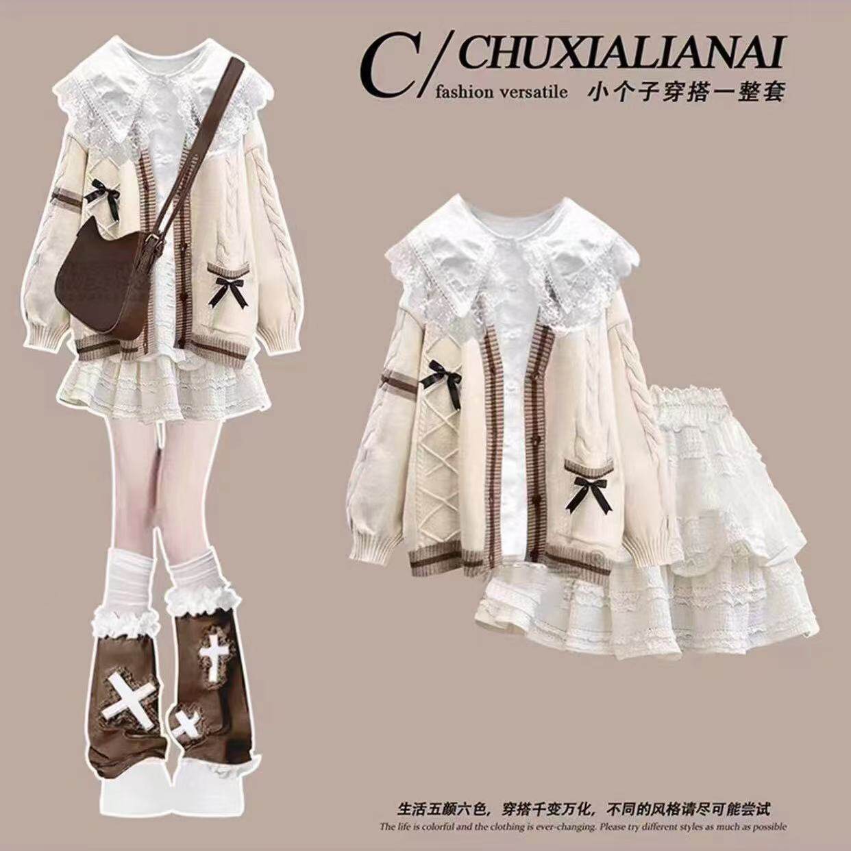 学院风小个子穿搭蛋糕裙jk套装 毛衣巨好看 春装 一整套 女学生开衫