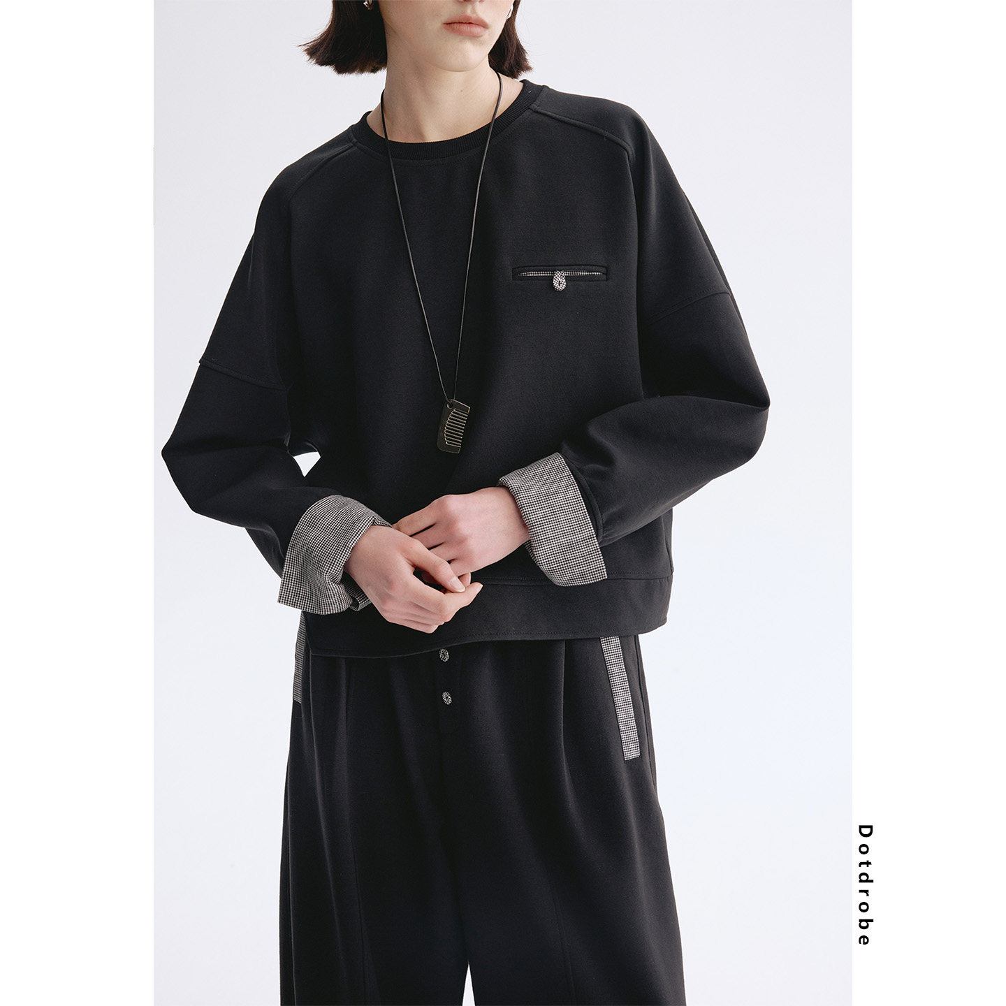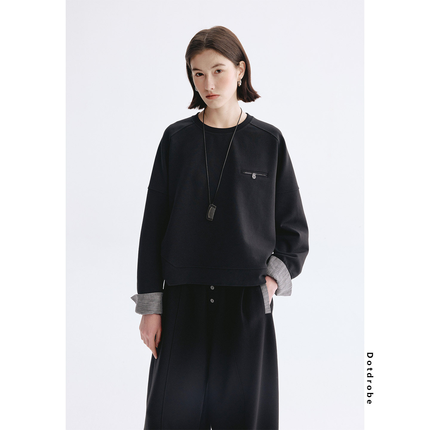 为您提供商品女春款 Dotdrobe多着 套装 弯刀型卫裤 假两件拼接袖 口极简卫衣的详细介绍,