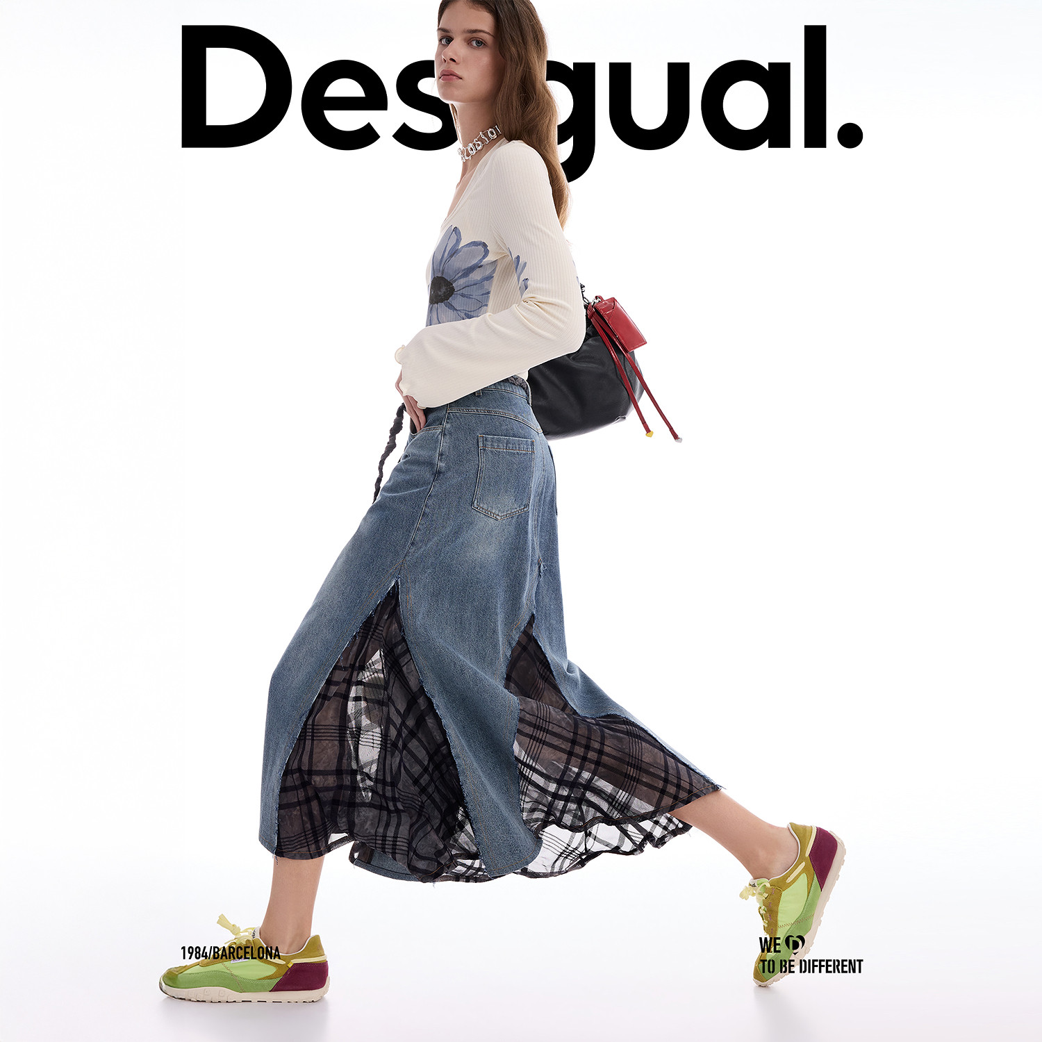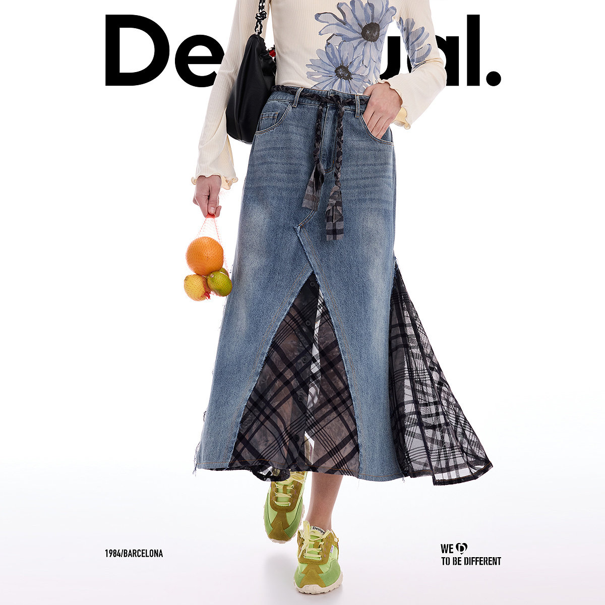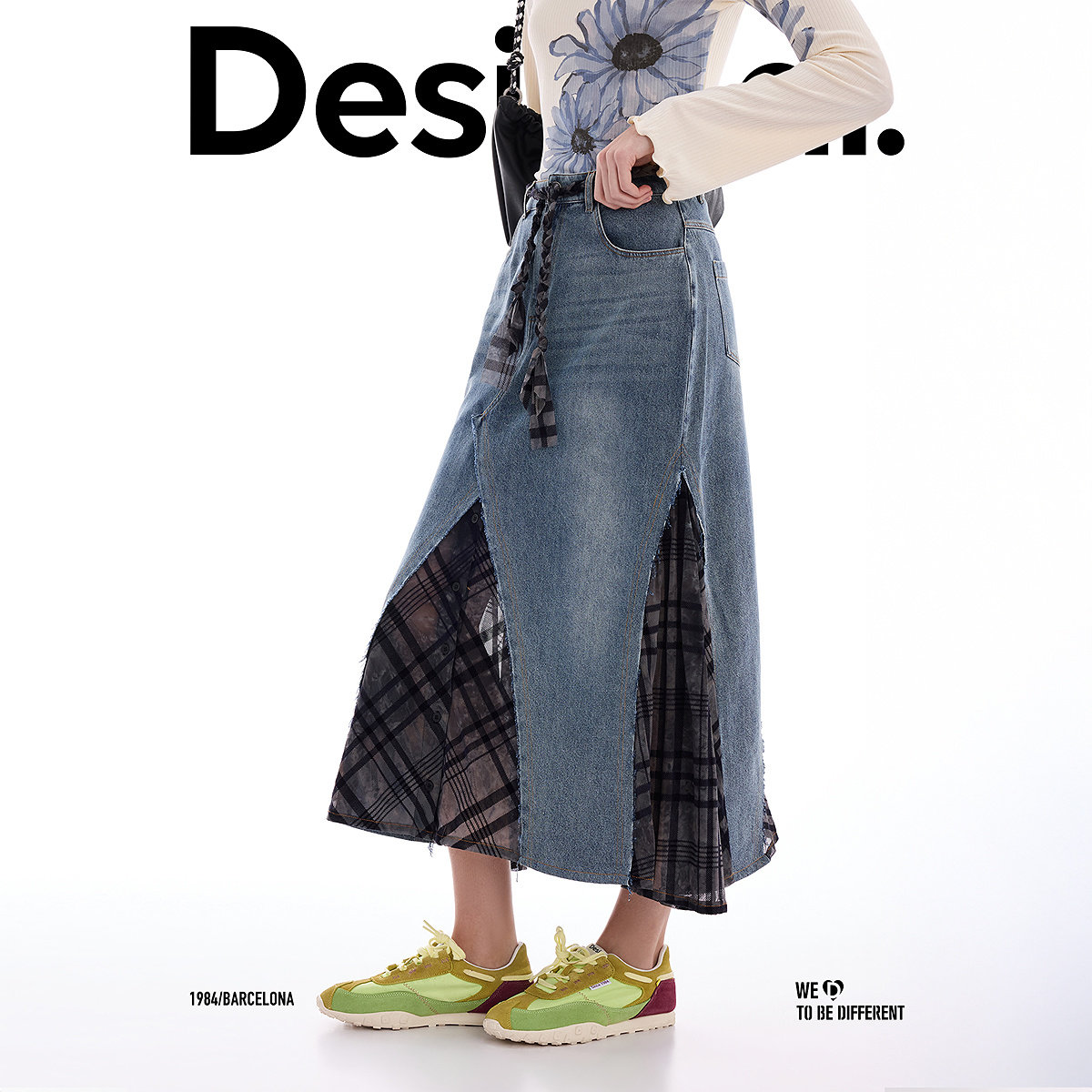 Desigual26春夏新品 半身裙 牛仔拼接网格植绒长款由