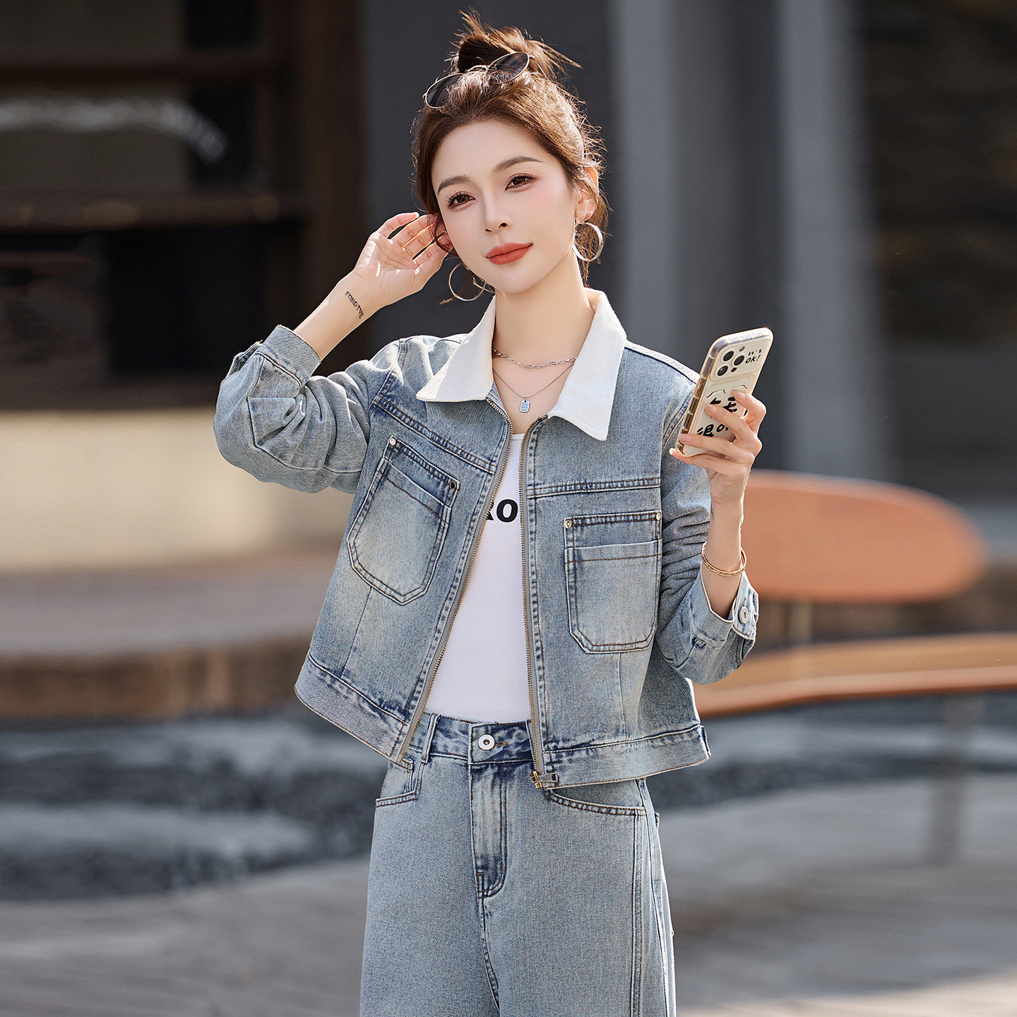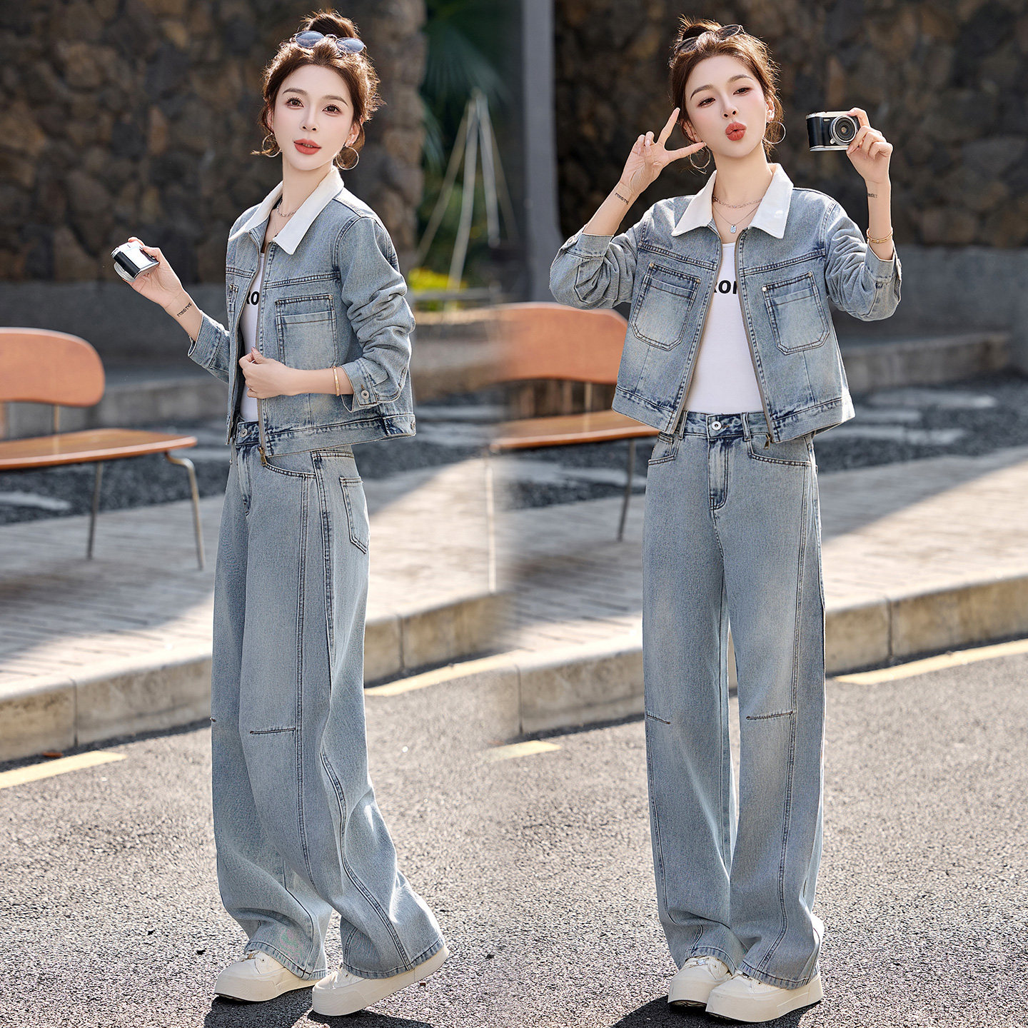 为您提供商品高级感显瘦洋气翻领外套阔腿裤 两件套 女2026春秋新款 休闲牛仔套装的详细介绍,