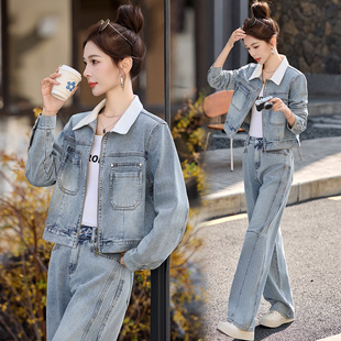 高级感显瘦洋气翻领外套阔腿裤 两件套 女2026春秋新款 休闲牛仔套装