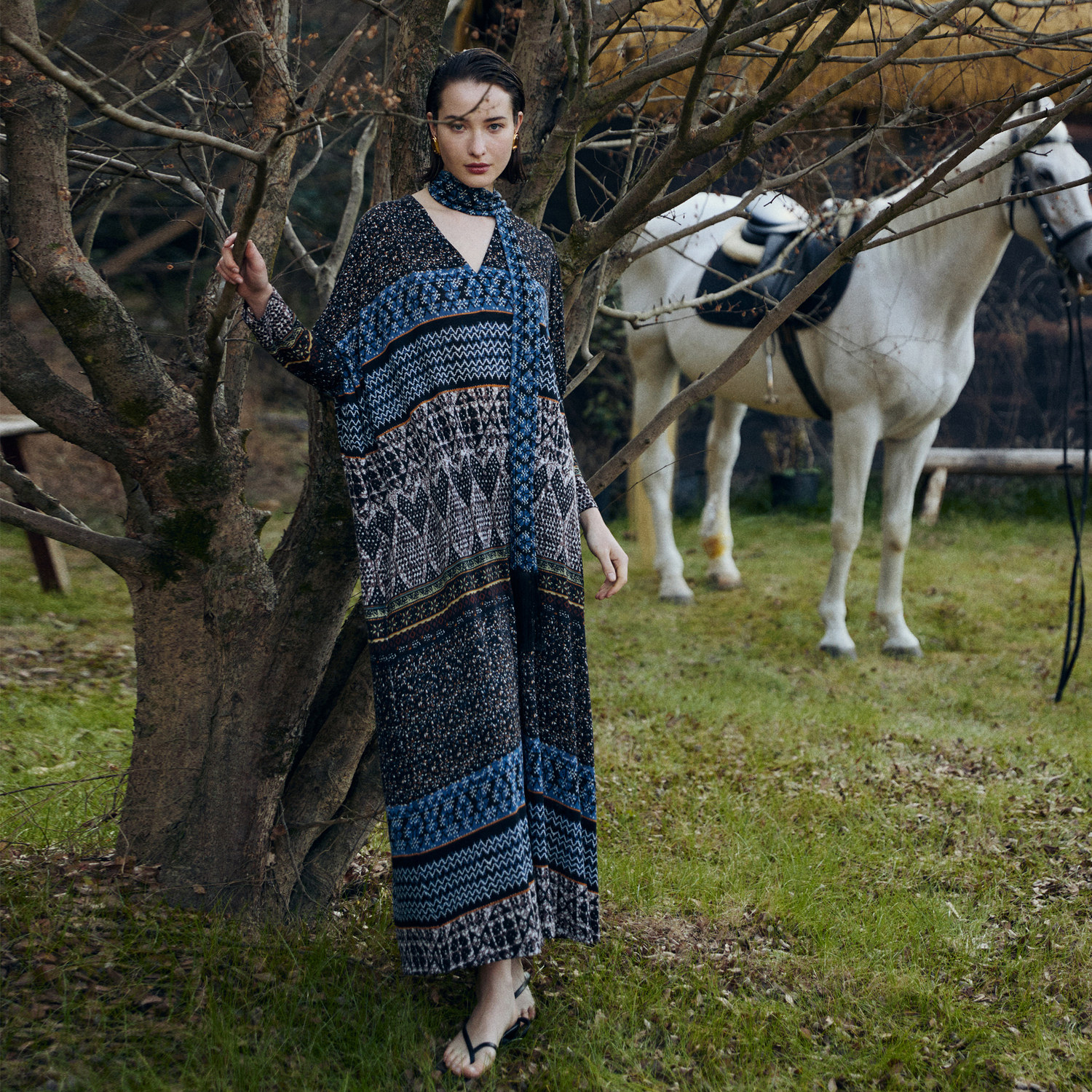 羊毛V领印花连衣裙2026年新款 宽松度假风长裙子 漠舞惊鸿