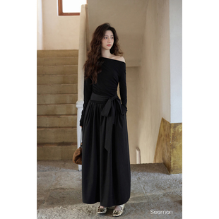 夕蒙2026新款 韩系气质小众裙子独特斜肩巨好看绝美黑色连衣裙 春季