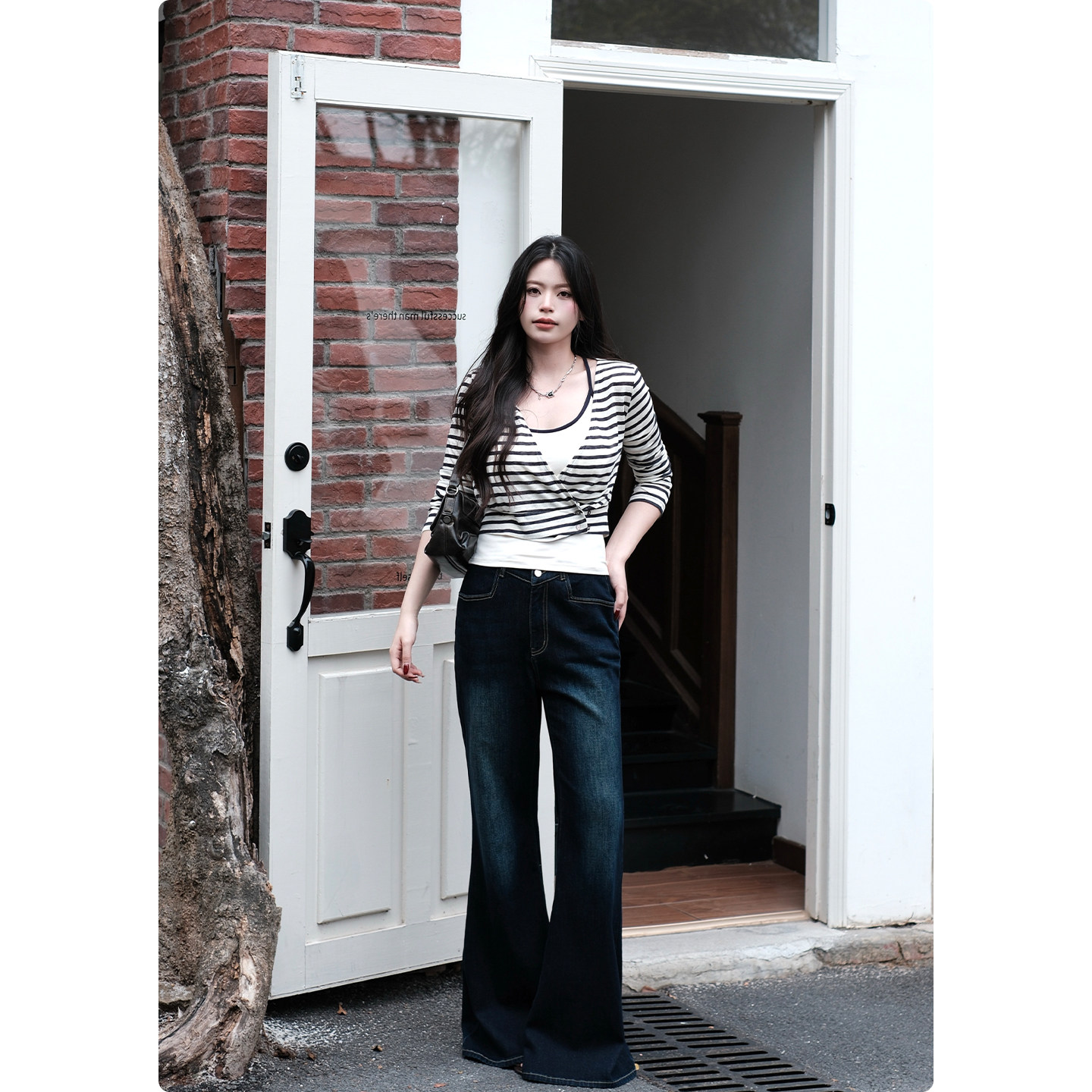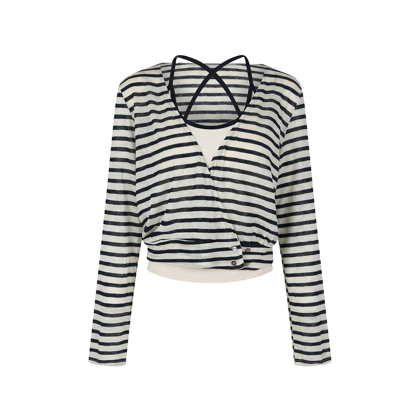 女 糯米子 无压出行 藏蓝色条纹针织衫 吊带背心真两件叠穿套装由