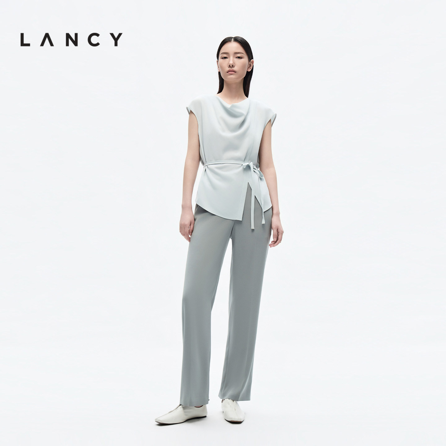 斜裁无袖 LANCY 绑带收腰上衣 荡领衬衫 三醋酸法式 朗姿2026夏季 新款由