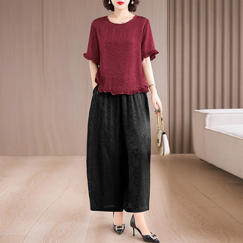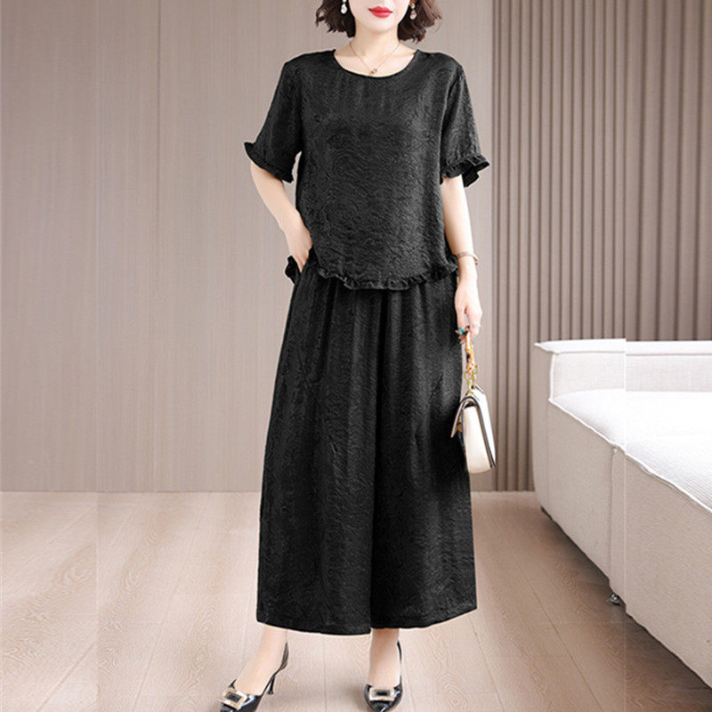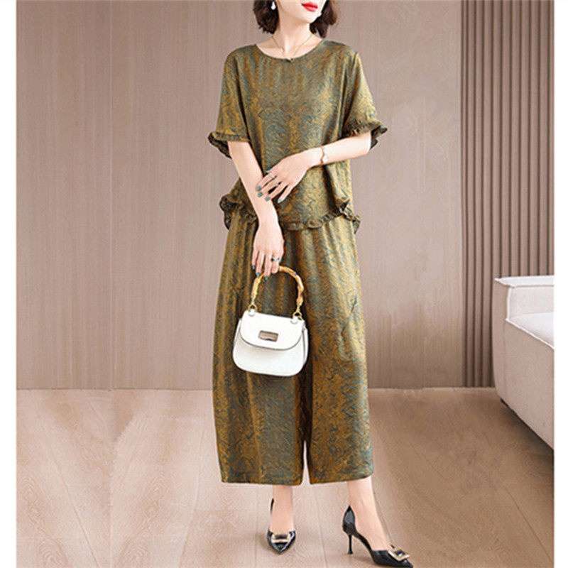 真丝上衣t恤衫 国风香云纱短袖 套装 妈妈夏装 子两件套 女休闲阔腿裤