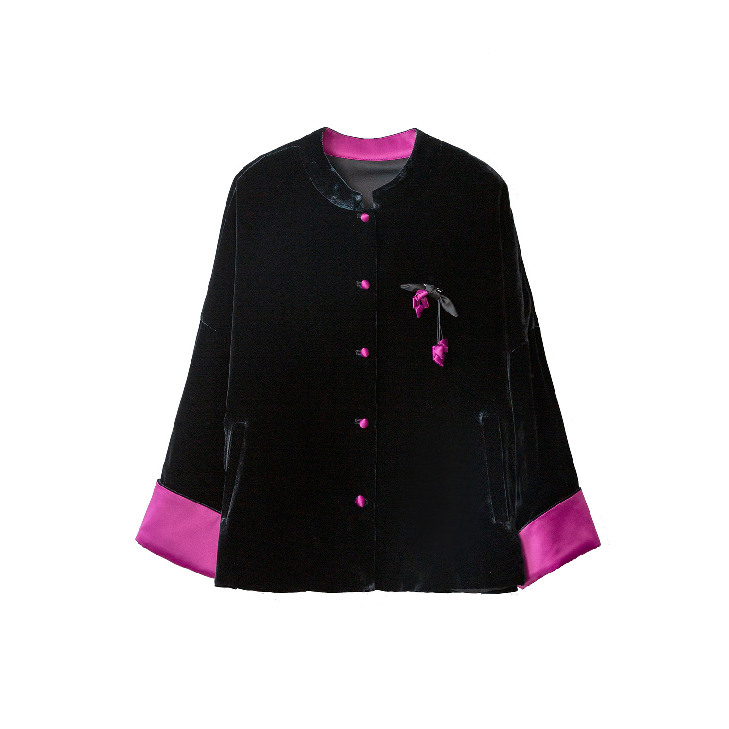 为您提供商品外套开衫 高定 撞色立领国风丝绒真丝挽袖 新中式 宽松 女桑蚕丝长袖的详细介绍,